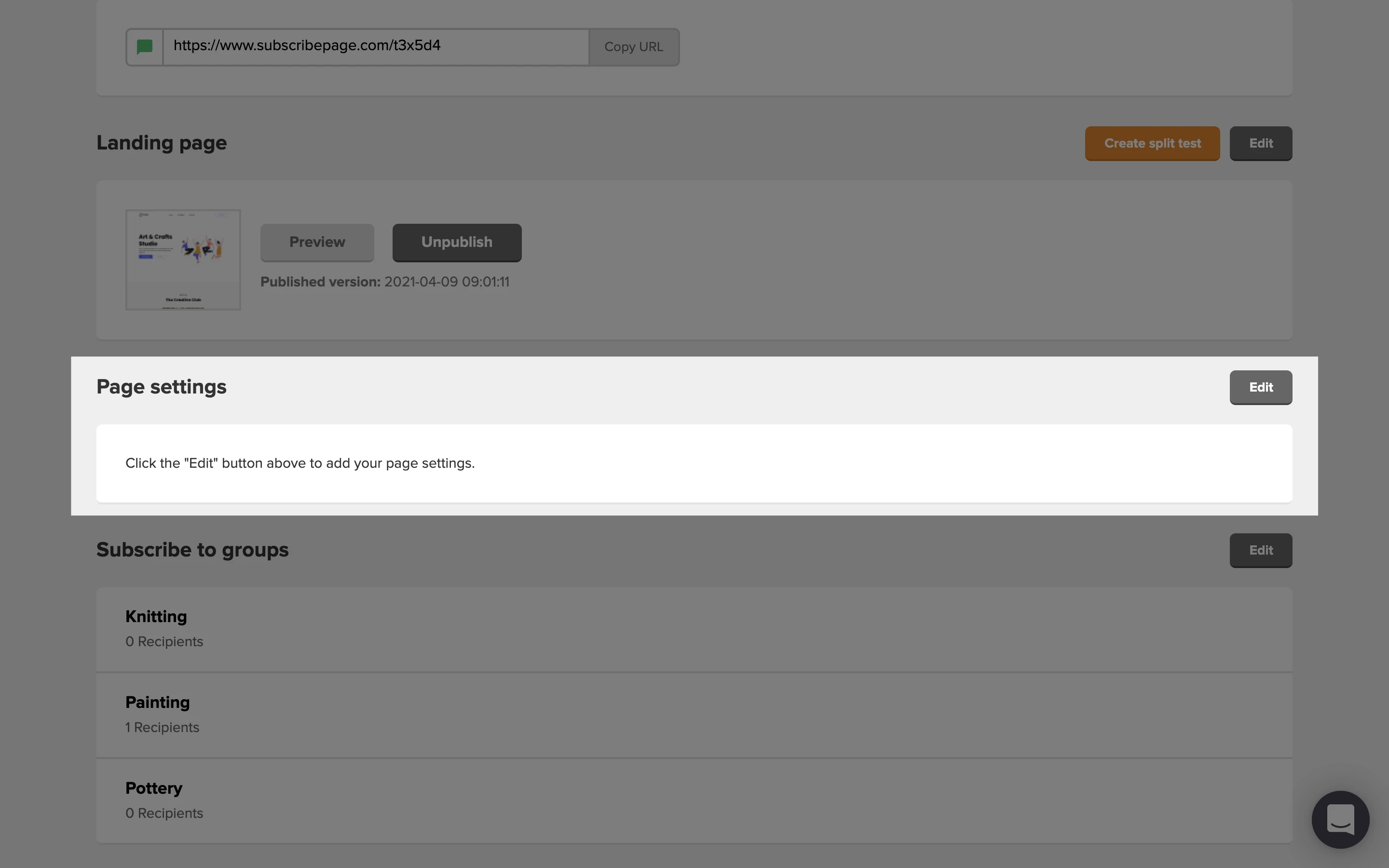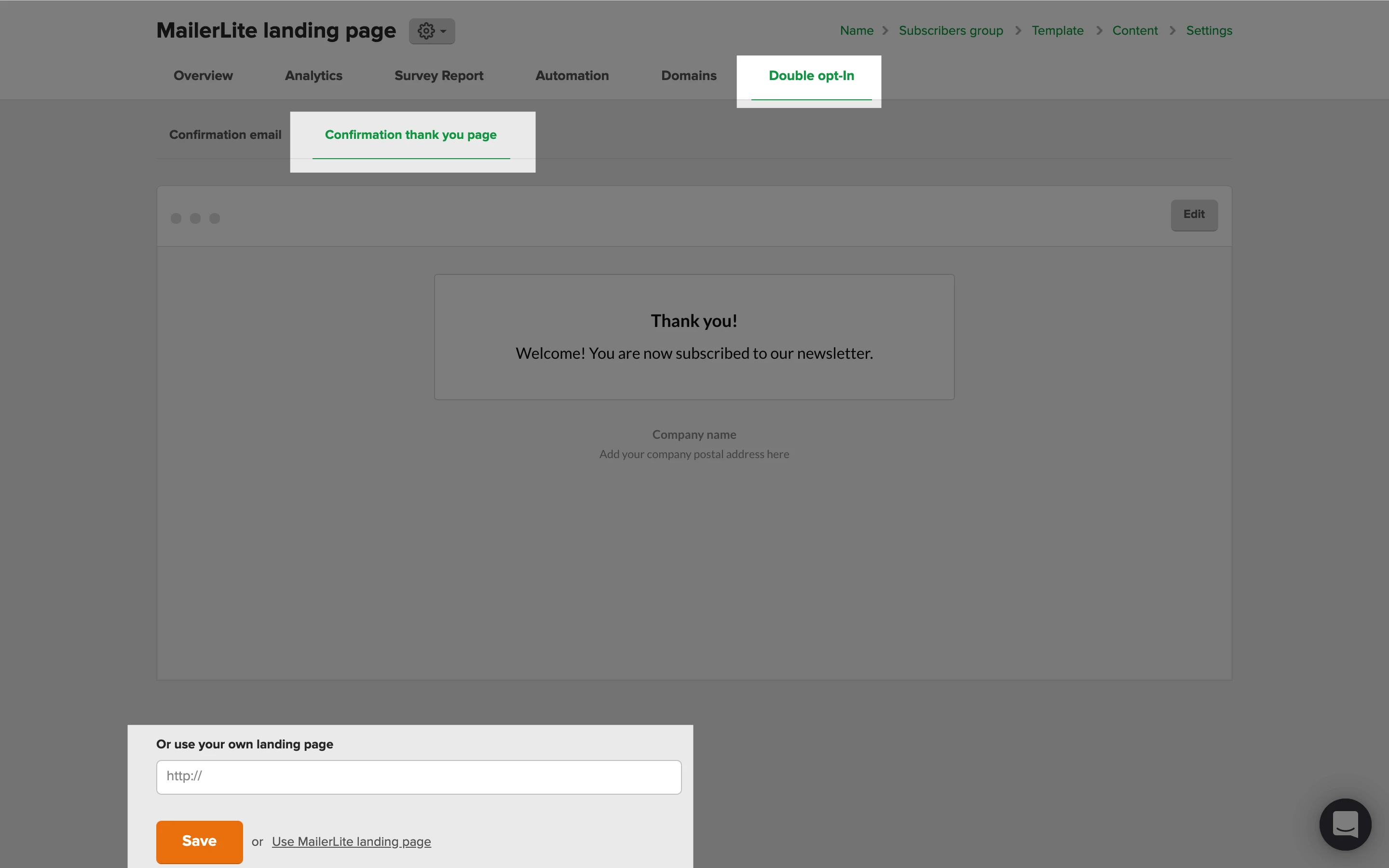 Enable double opt-in and insert the Meta Pixel on a custom Confirmation thank you page. This way, only those who confirm their subscription will be redirected to this custom page. To do this, head to the Double opt-in tab of the landing page, select the Confirmation thank you page tab, and scroll down to the Website URL section.