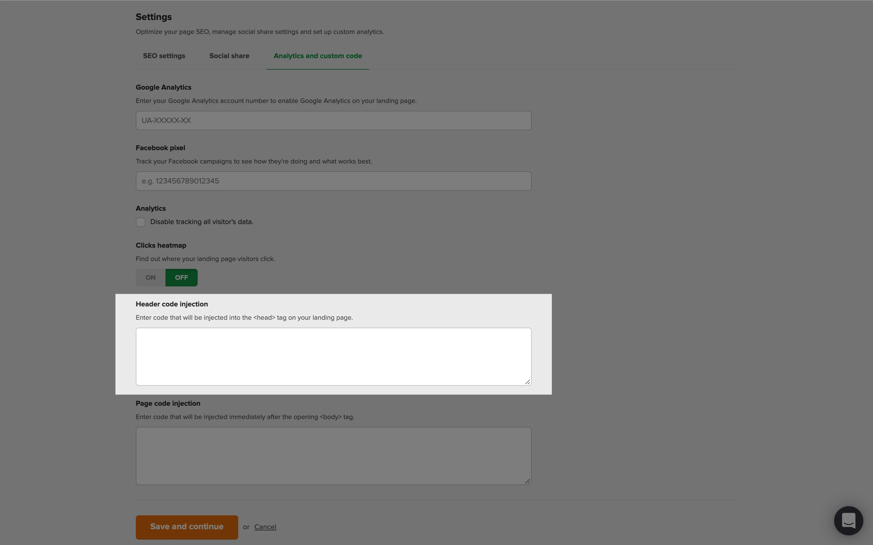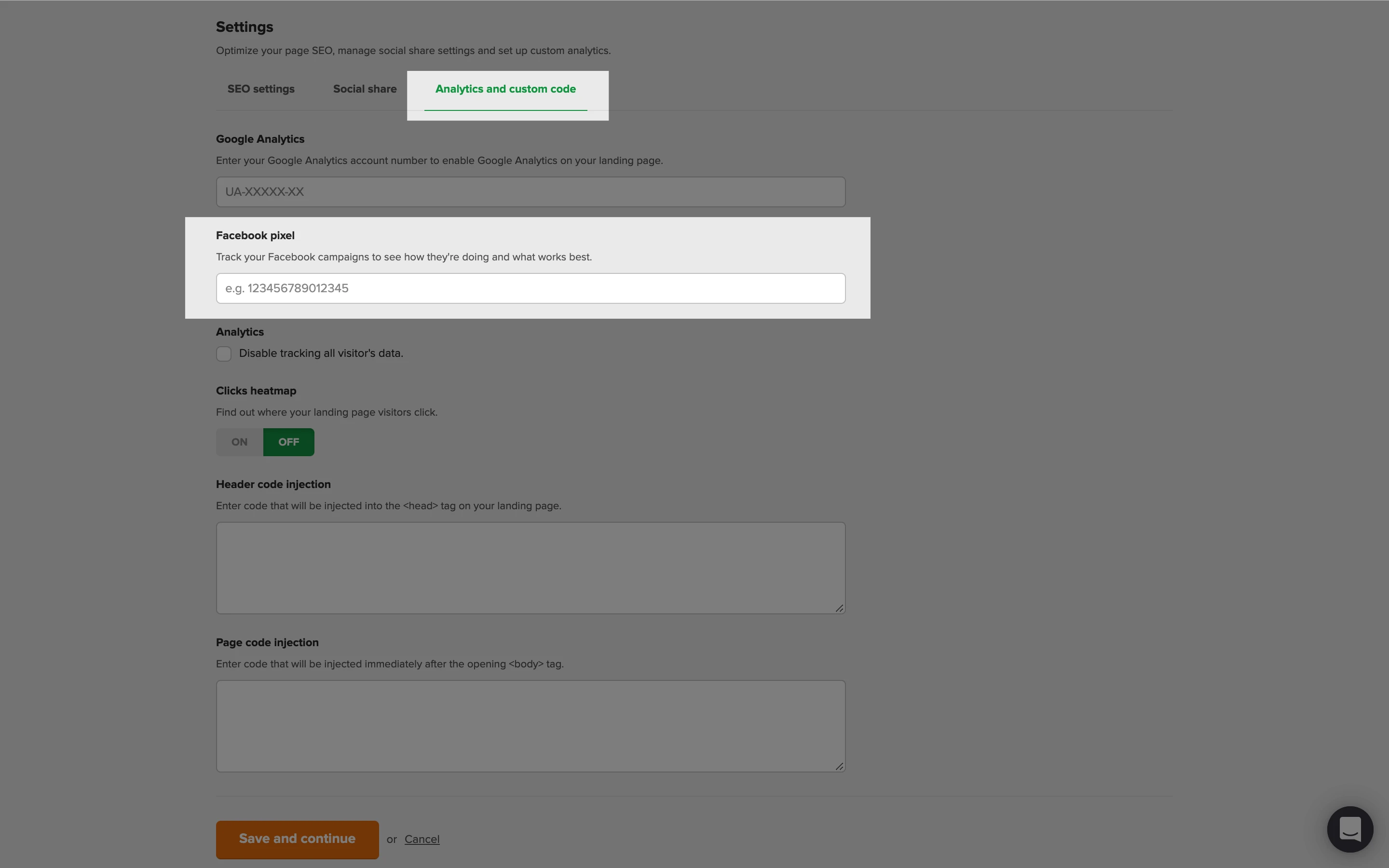 Under Settings, select the Analytics and custom code tab to view the Facebook pixel text box.