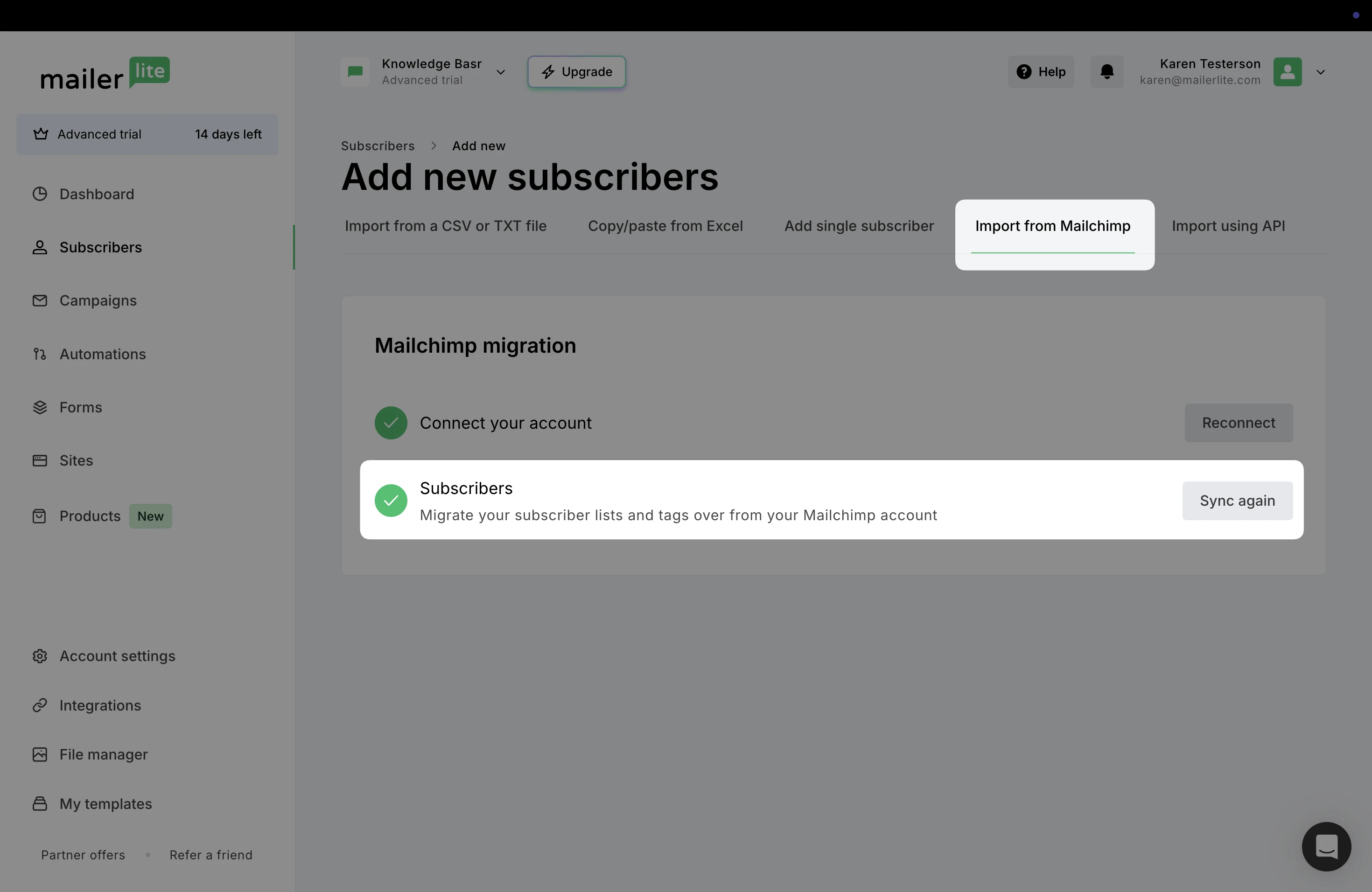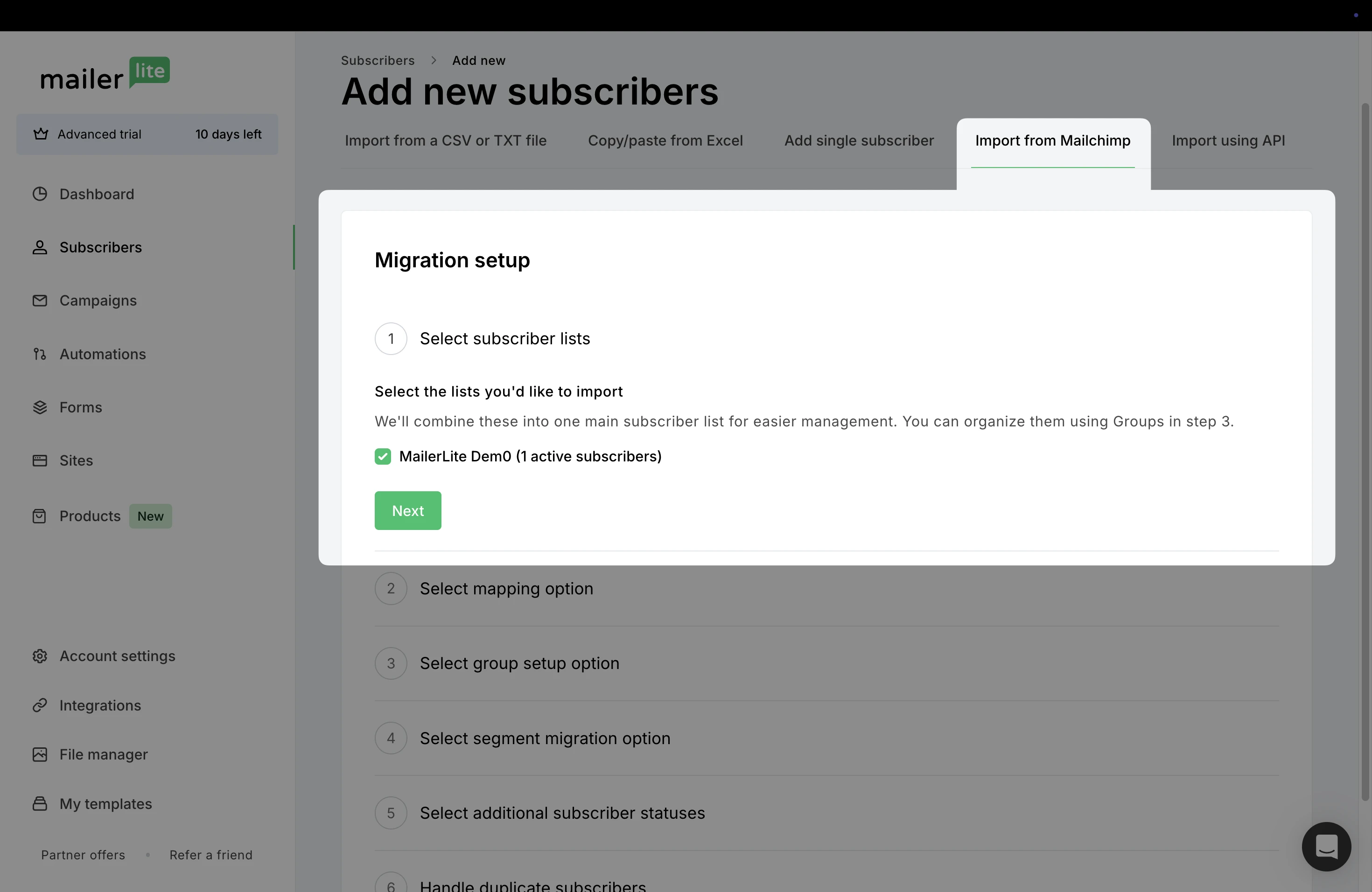 In just a few simple steps, you can bring your subscribers from Mailchimp to MailerLite using our Mailchimp import tool.