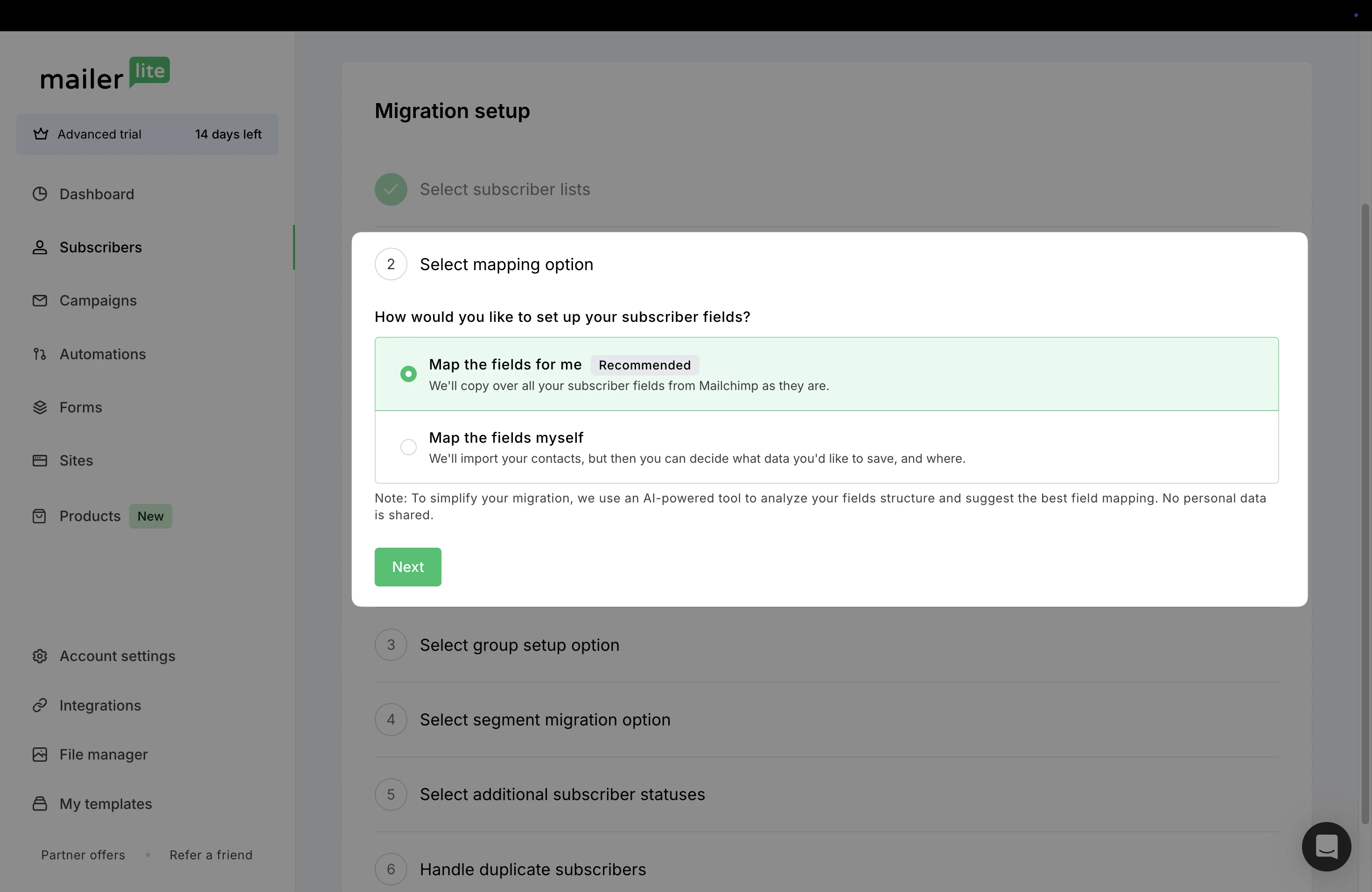 Map the fields for me: Our system will automatically detect, match, and create custom fields in MailerLite based on the information from your Mailchimp account.