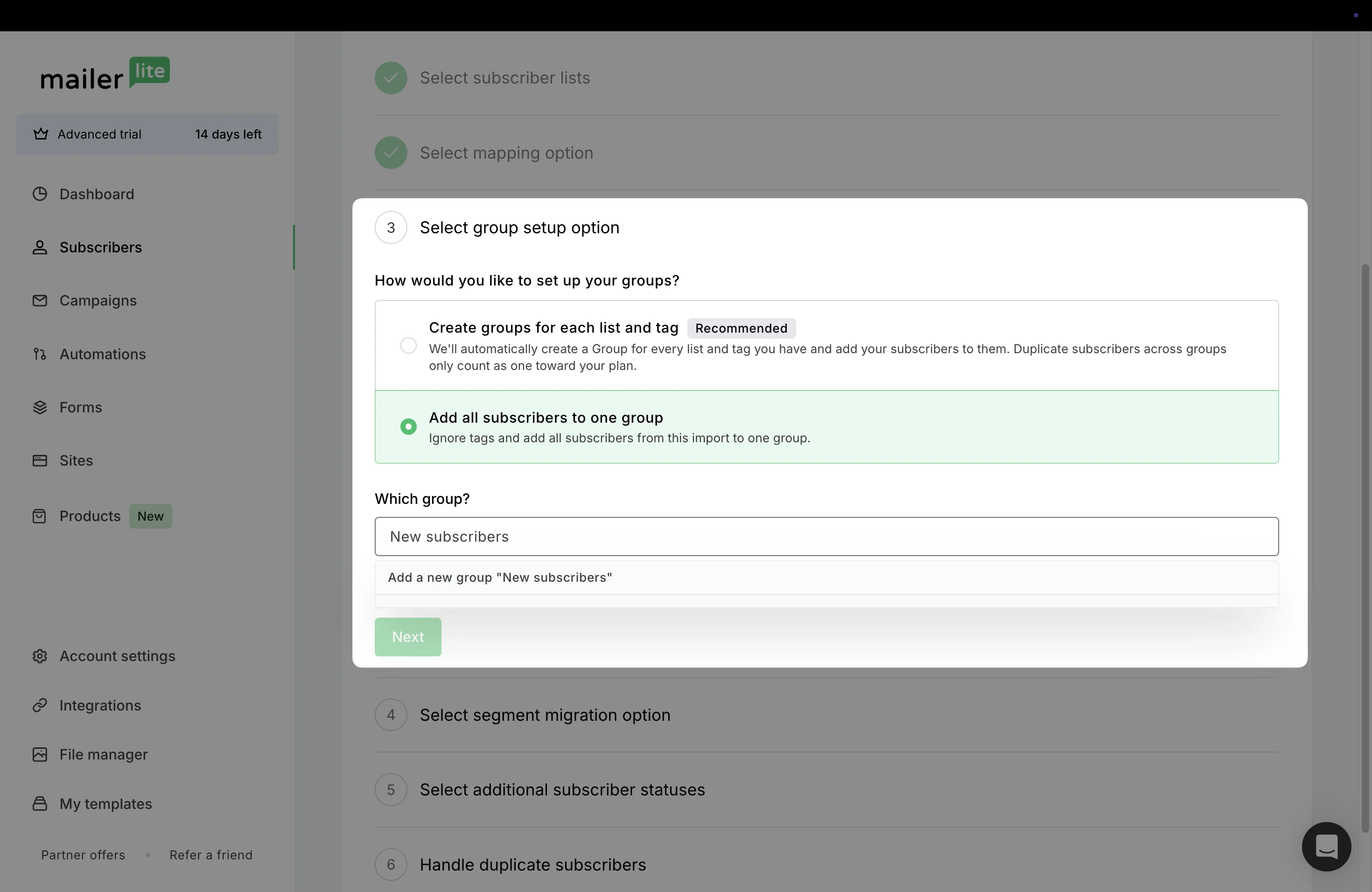 10. Select group setup option. Choose how your Mailchimp tags will be organized in MailerLite.