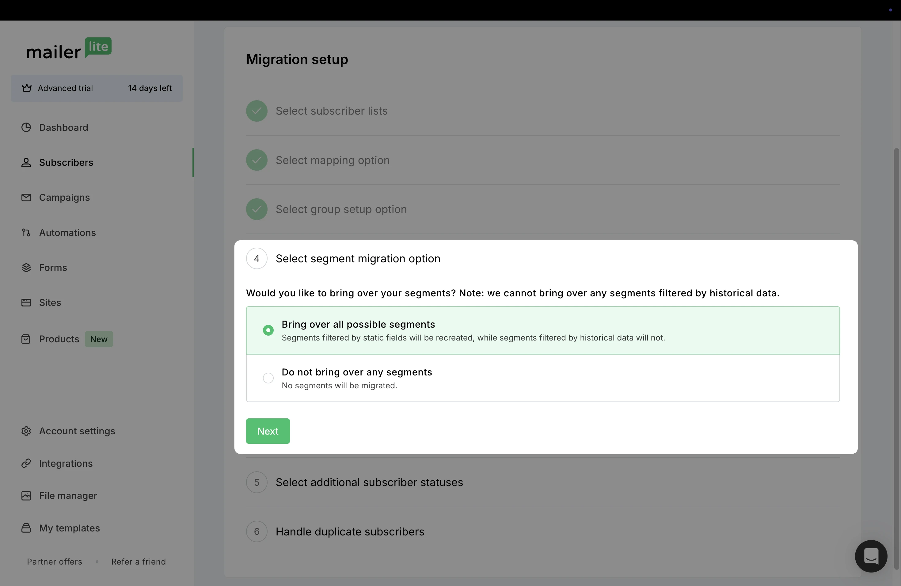12. Select segment migration option. Choose how segments in your Mailchimp account will be migrated.