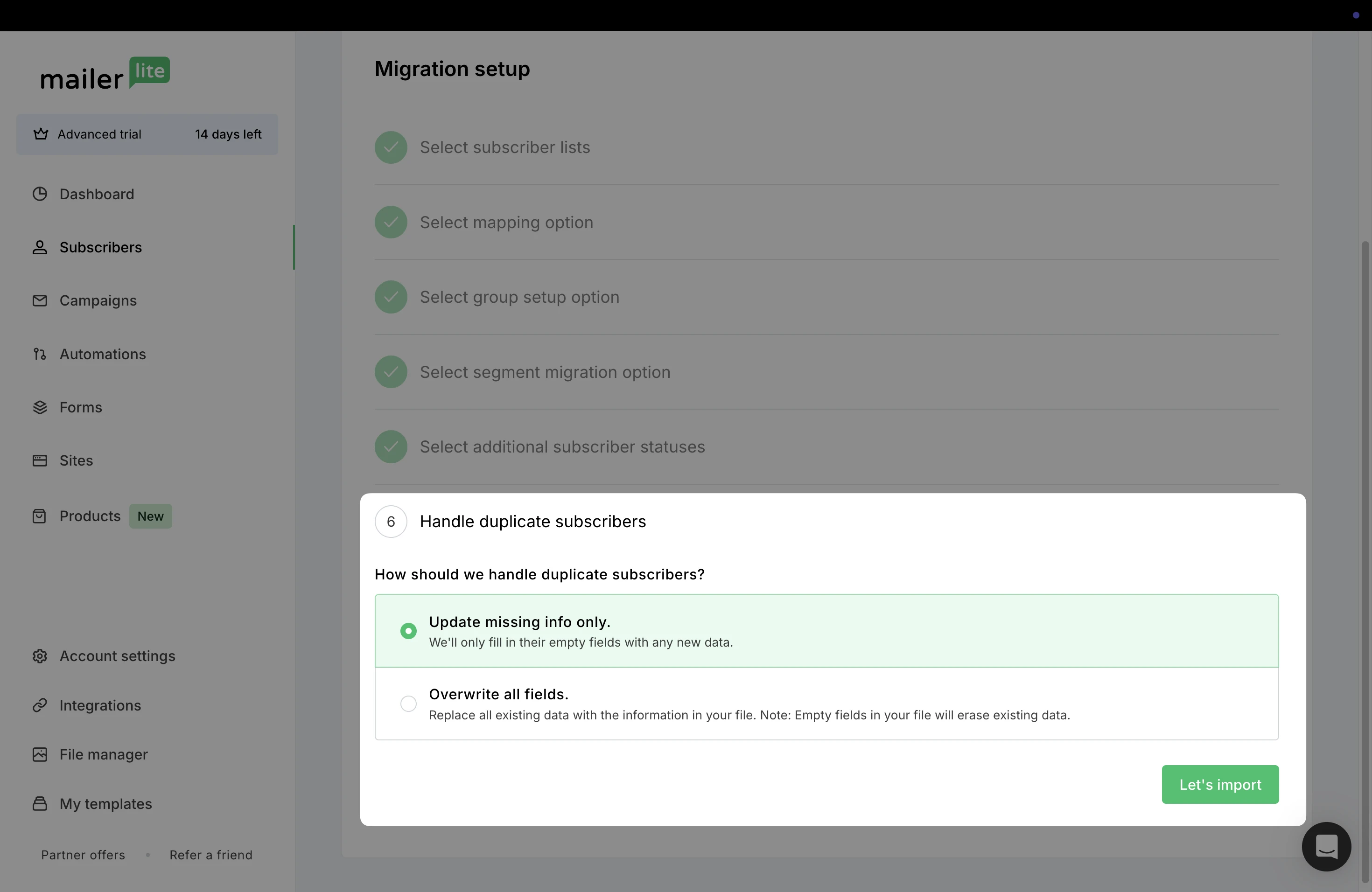 15. Handle duplicate subscribers. Decide how MailerLite should handle duplicate subscribers from your import if they are already in your MailerLite account.