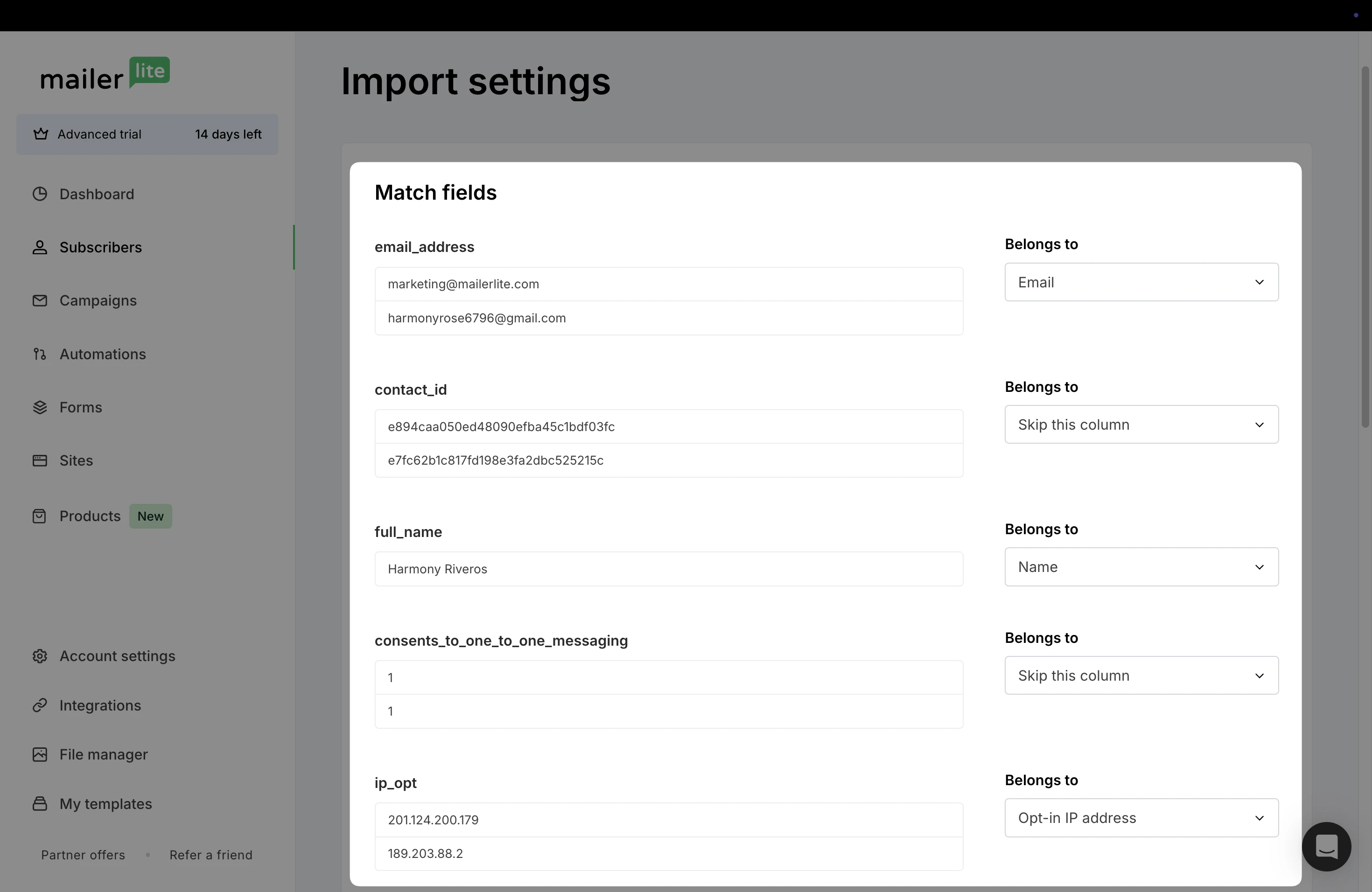 If you chose to match subscriber fields manually, you can now match the fields from your Mailchimp export to the correct subscriber fields in your MailerLite account.