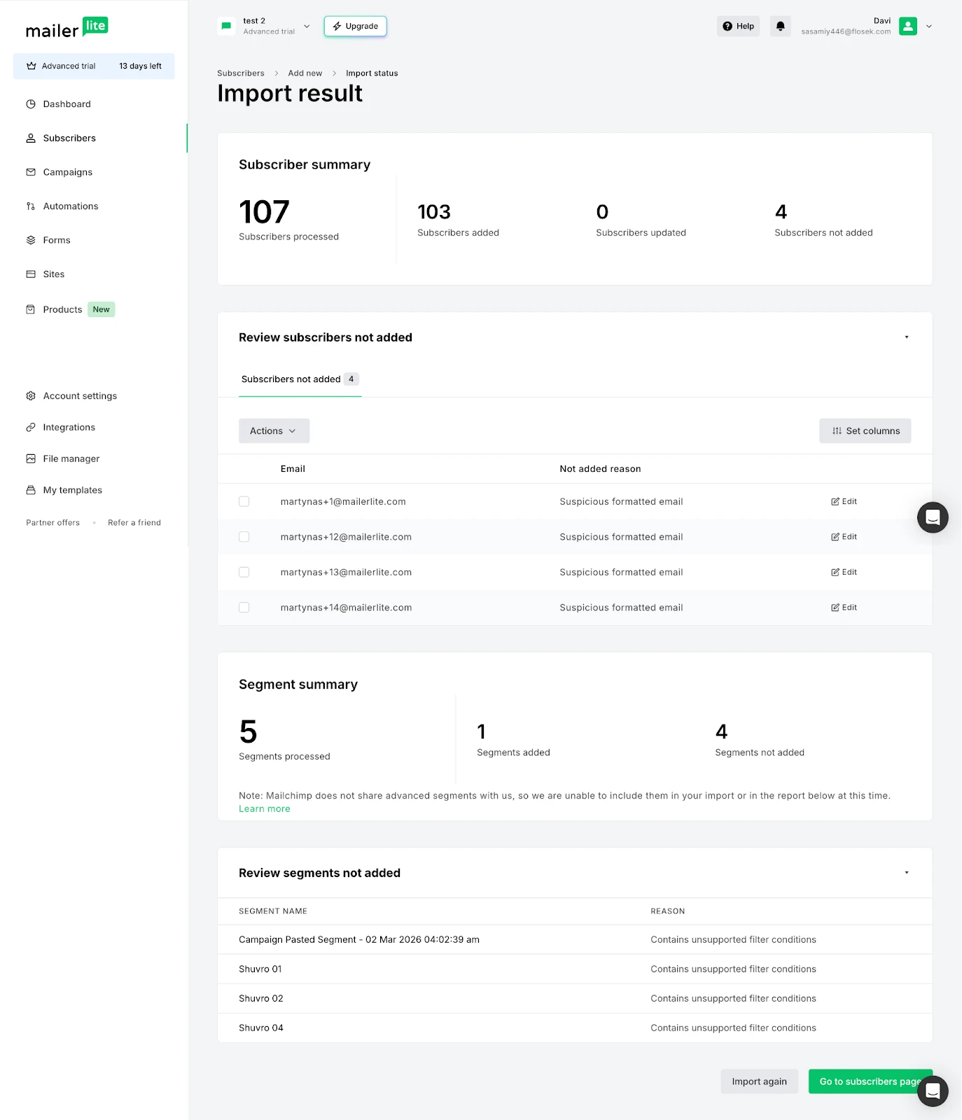 Mailchimp has two types of segments: basic segments and advanced segments. Only basic segments are accessible for MailerLite, while Advanced segments (such as behavioral, e-commerce, or activity-based conditions) are not, and therefore cannot be imported over.