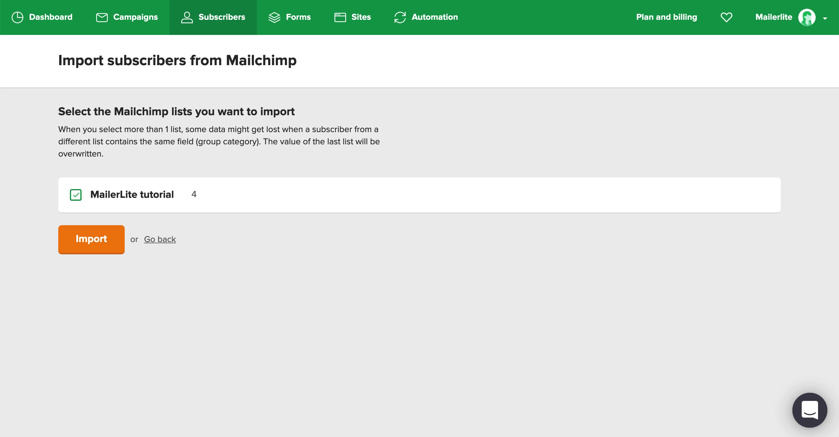Select the lists you wish to import to MailerLite.