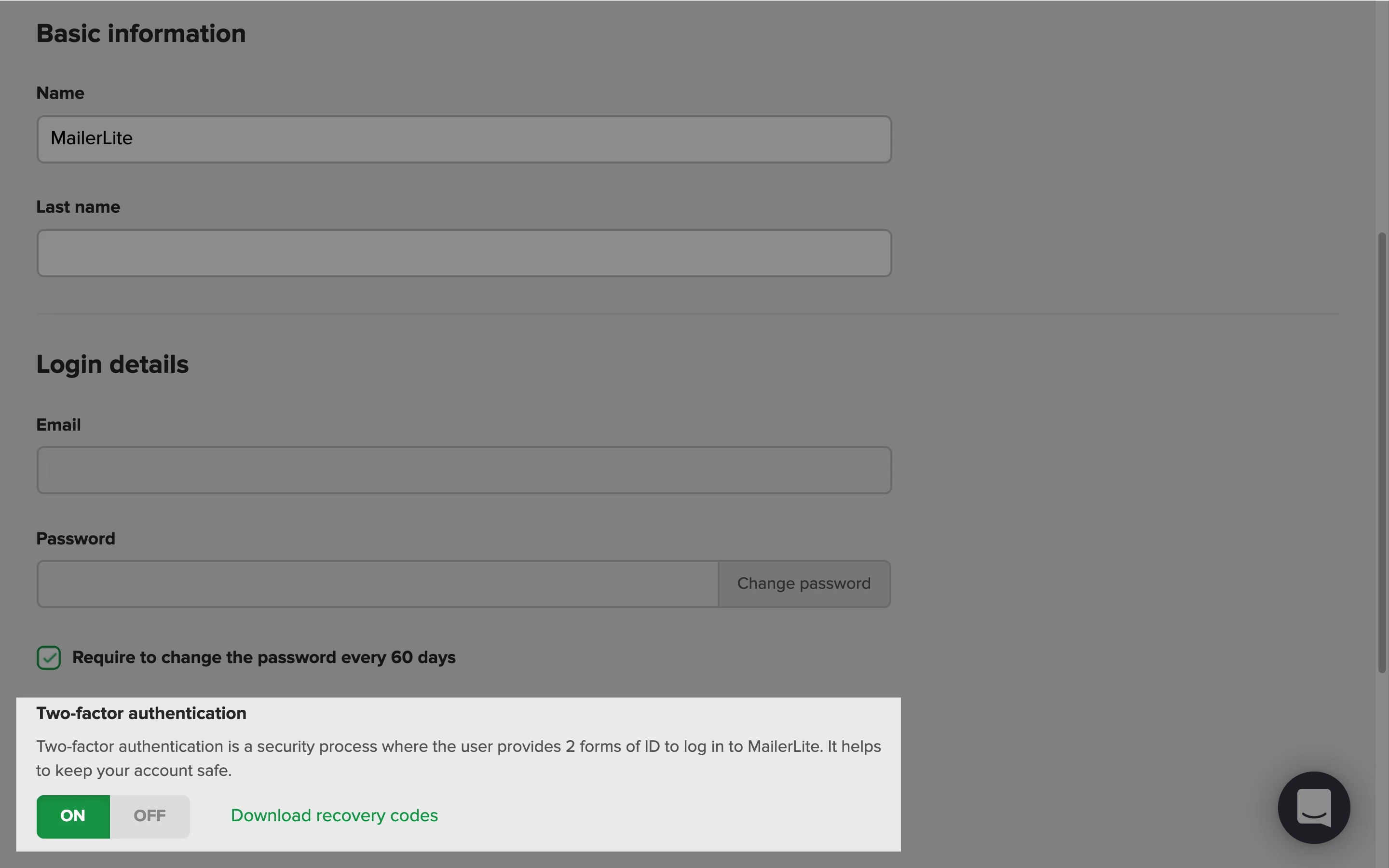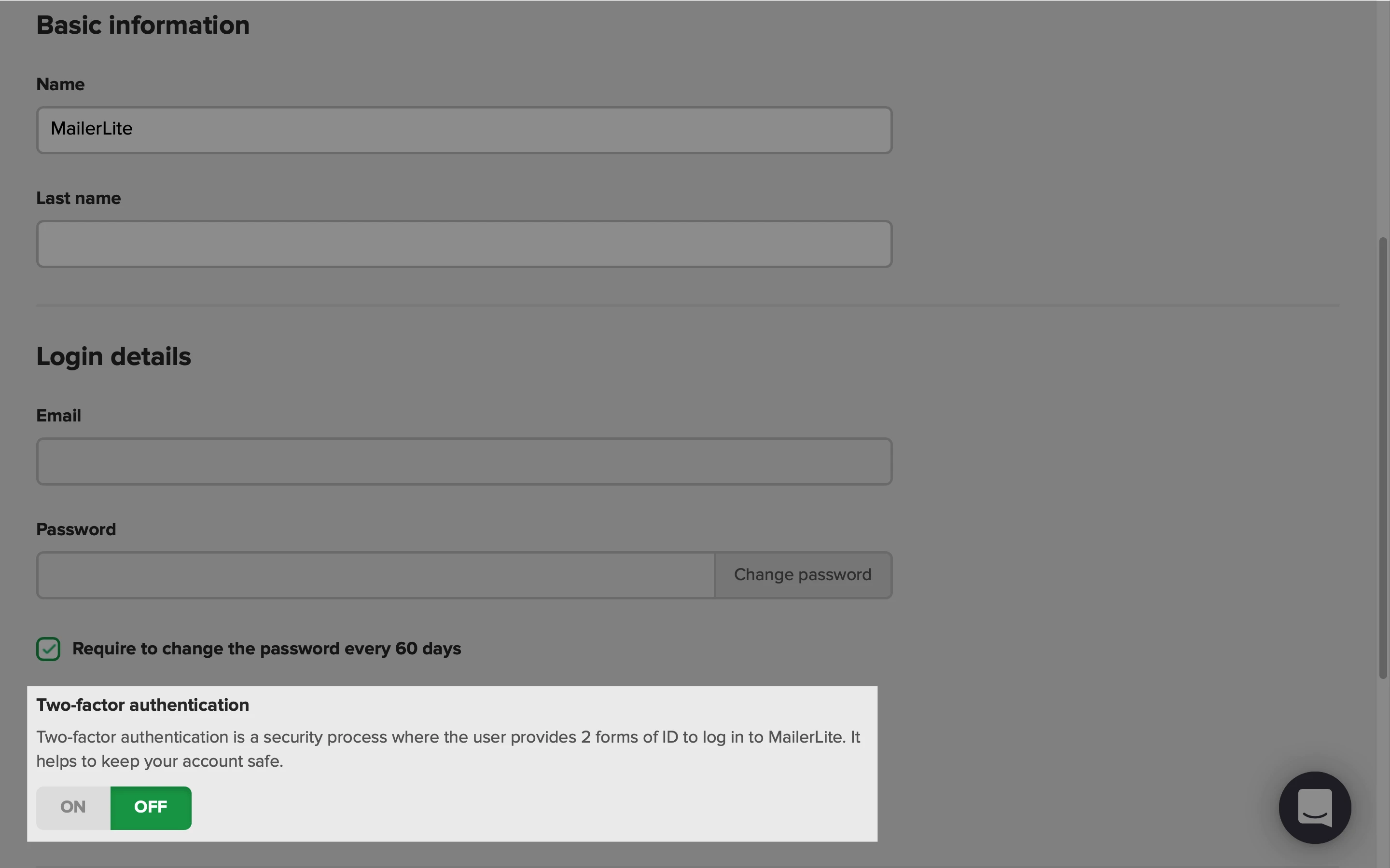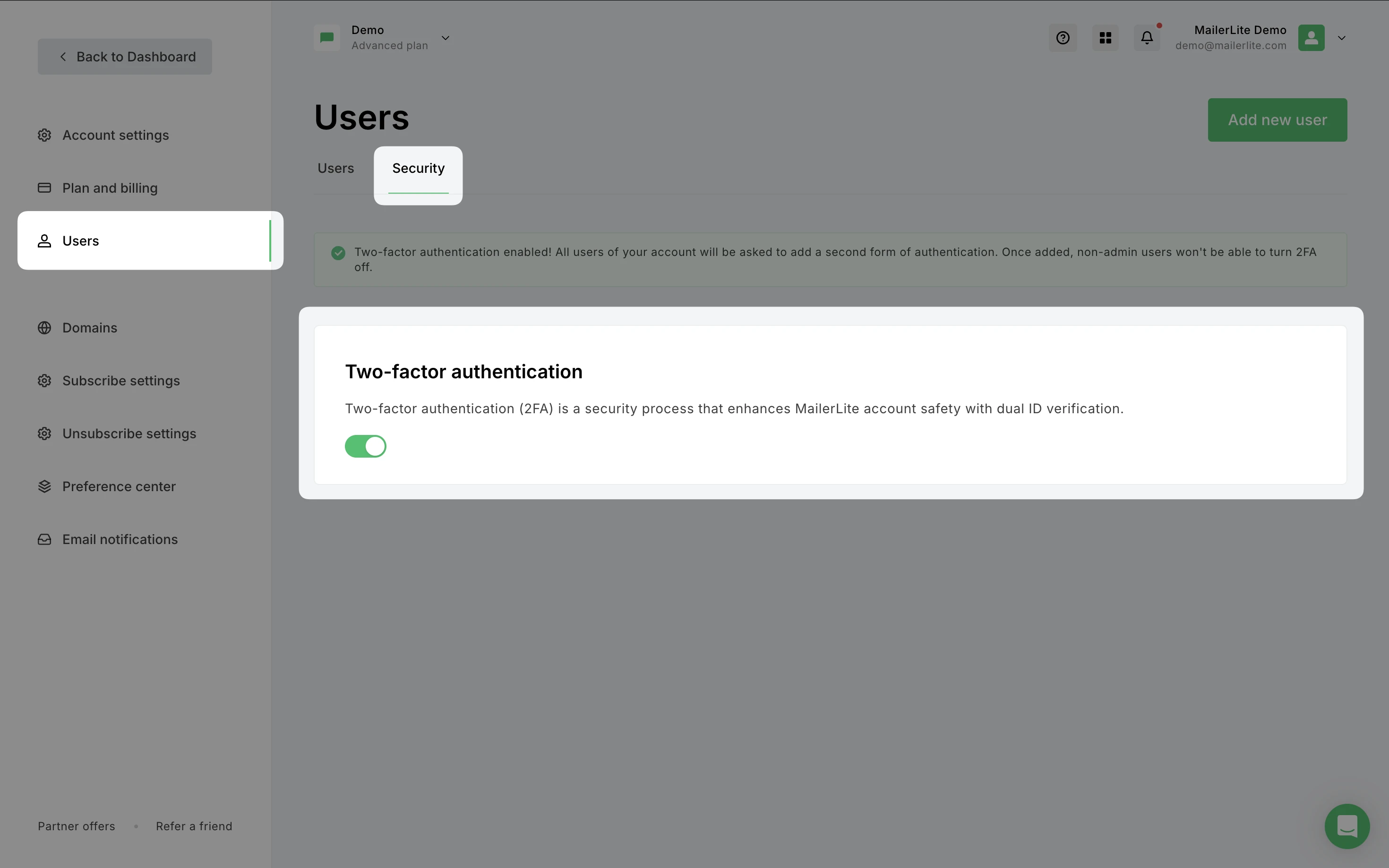 4. Toggle the option ON to enforce two-factor authentication across all account users.