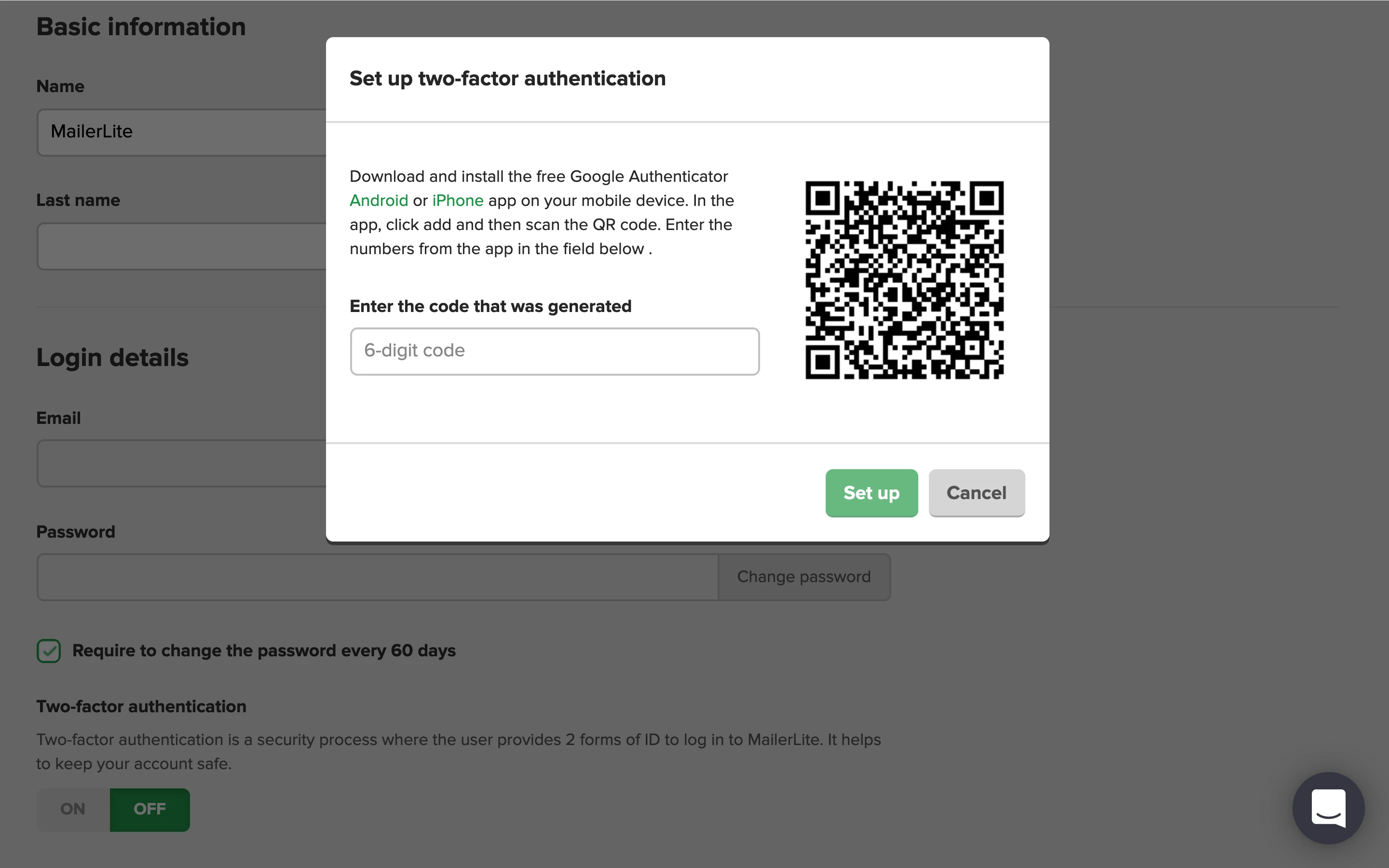 3. Follow the instructions on the screen and link your authenticator app with your MailerLite account by scanning the QR barcode provided on your MailerLite profile page.