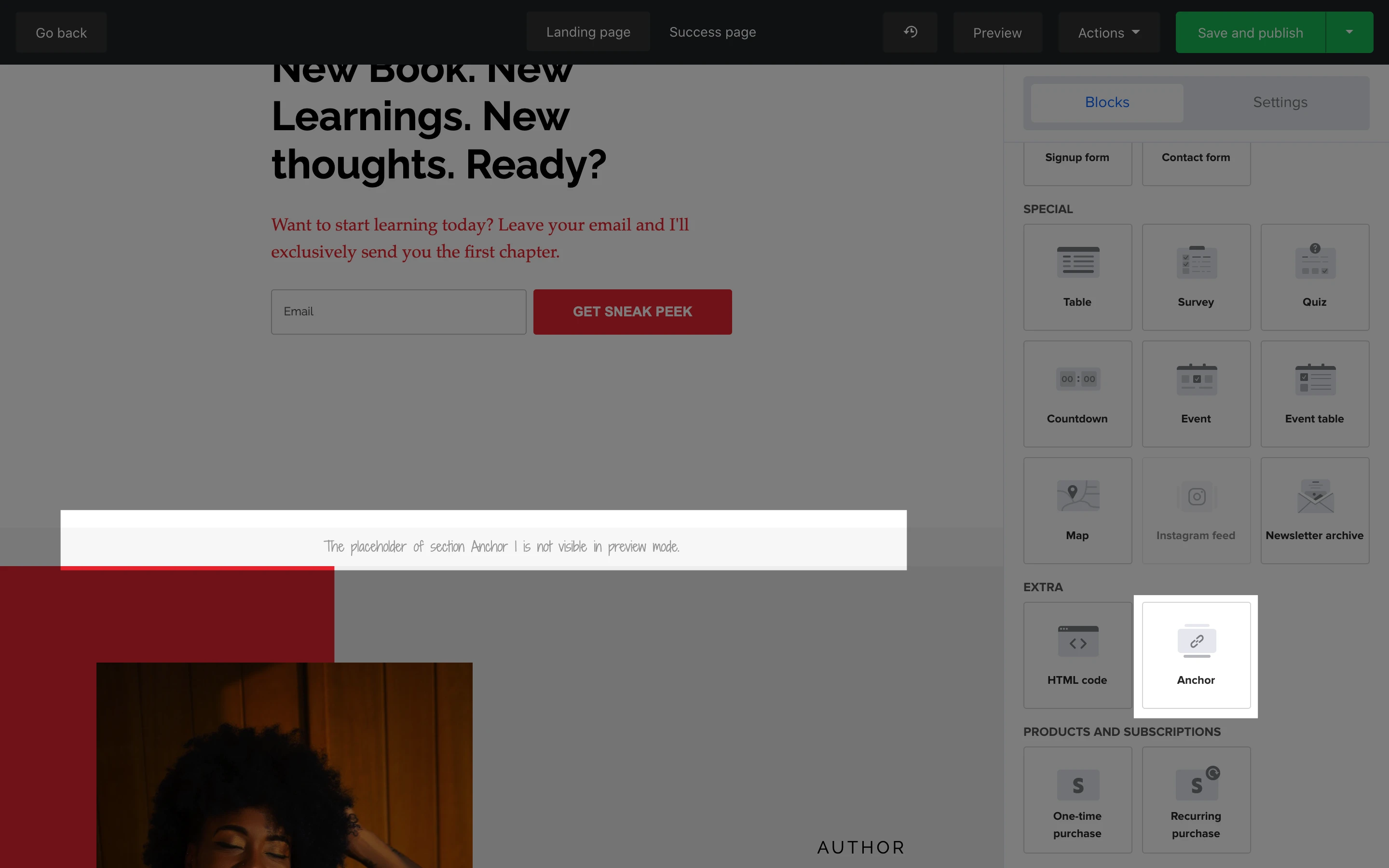 Drag the Anchor block from the sidebar and drop it onto your page. The Anchor block won’t be visible on your published site. It simply provides an (invisible) anchor to link to, so where you place your Anchor block will be the endpoint of your anchor link.