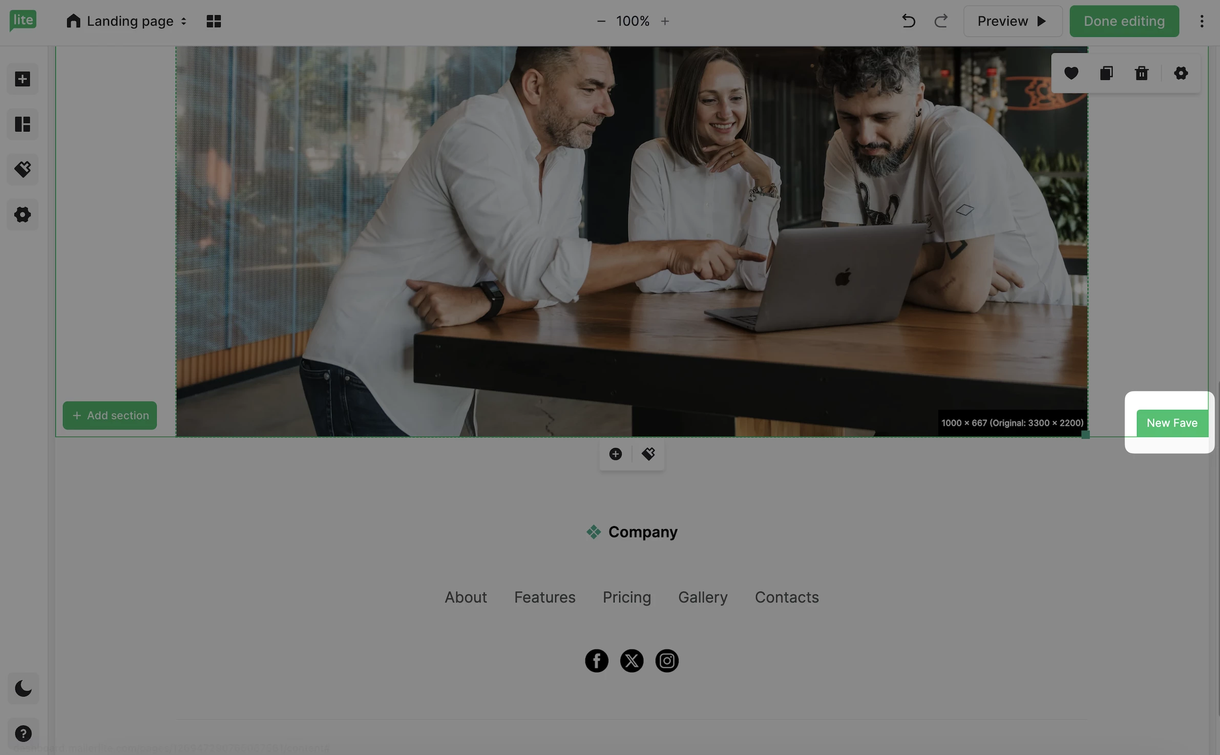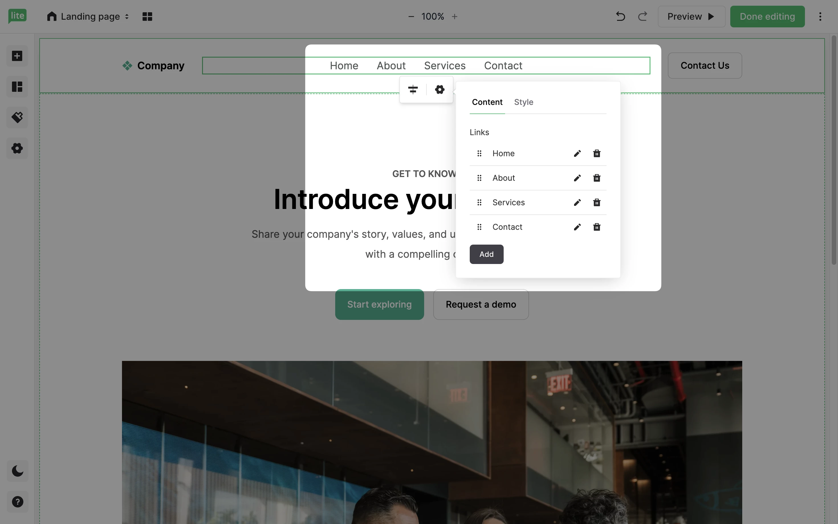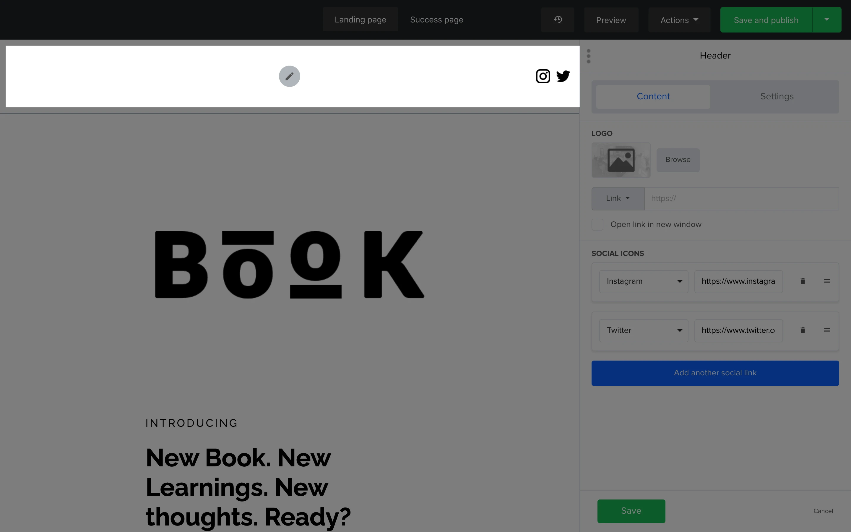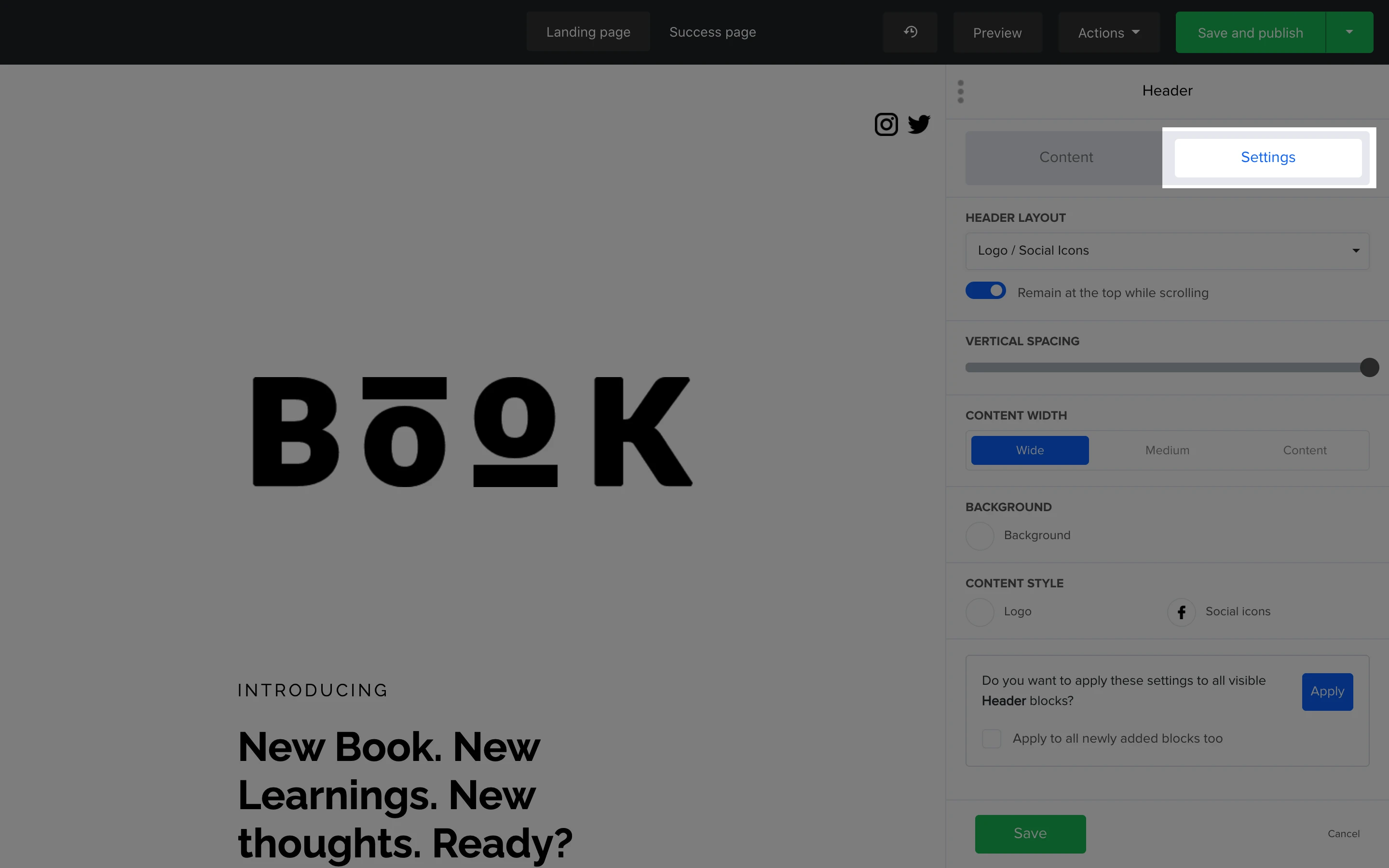 4. Scroll to the top of your landing page and add a Menu element to the page, or a Section that includes a Menu. Hover over it and click the Settings icon.