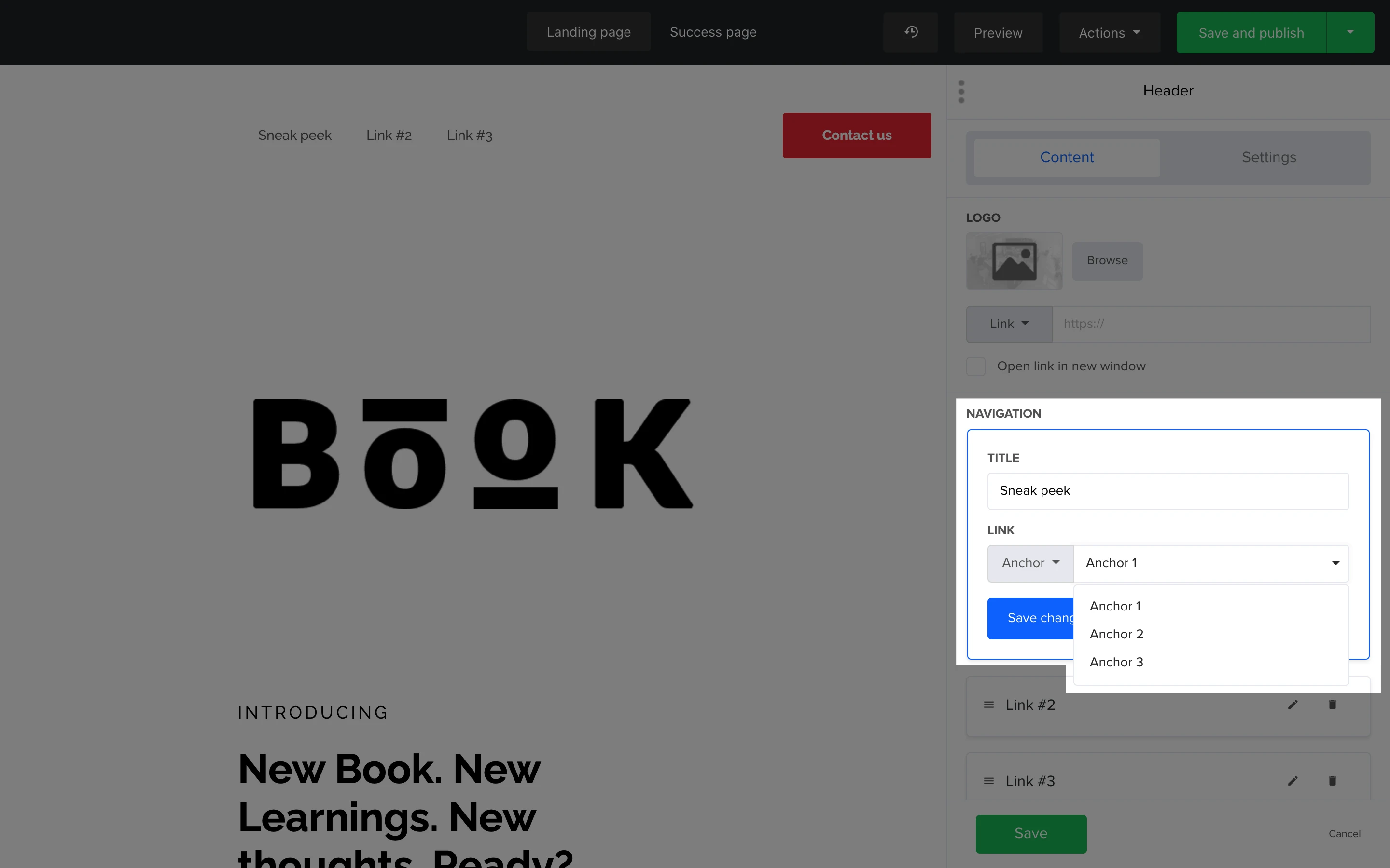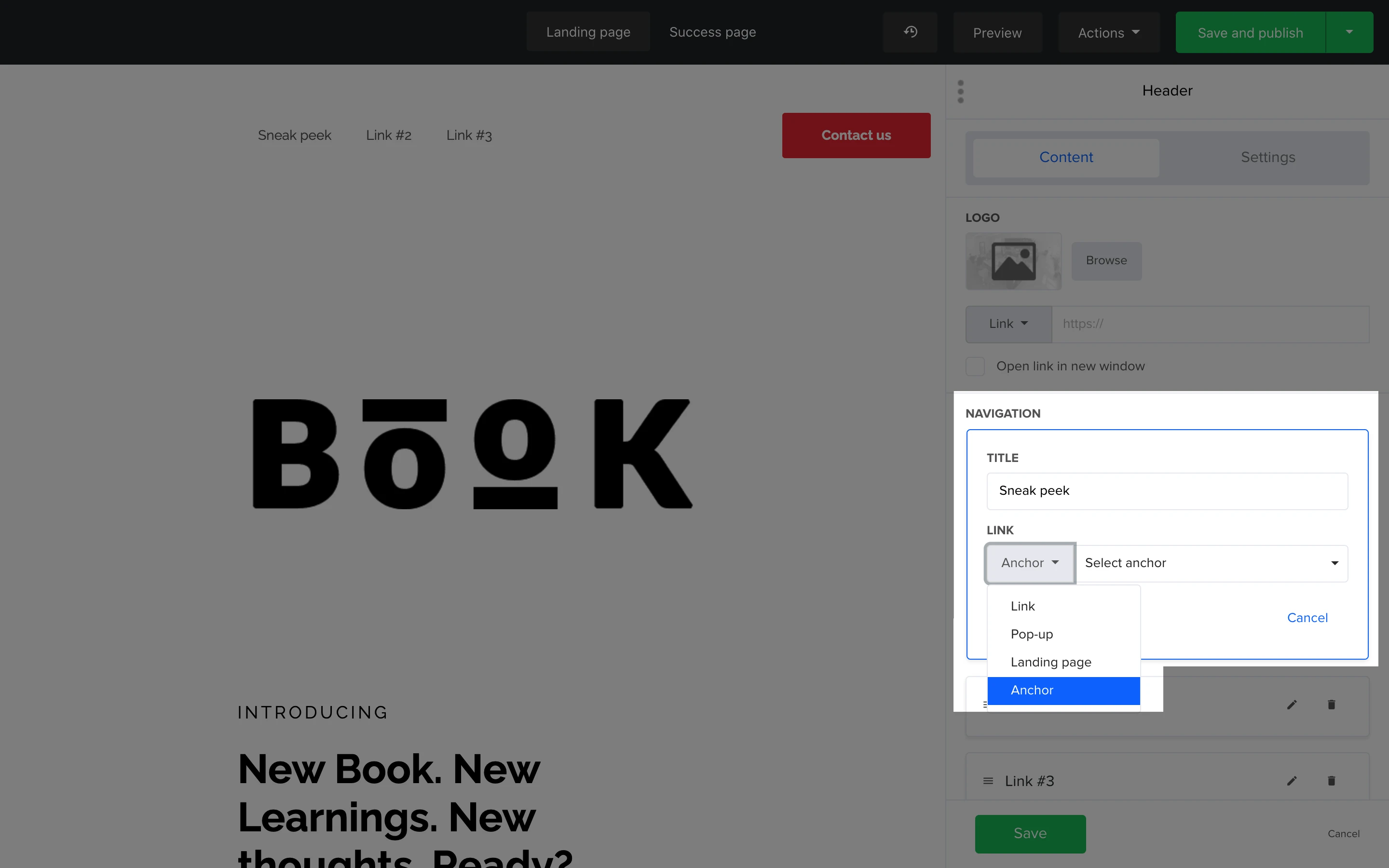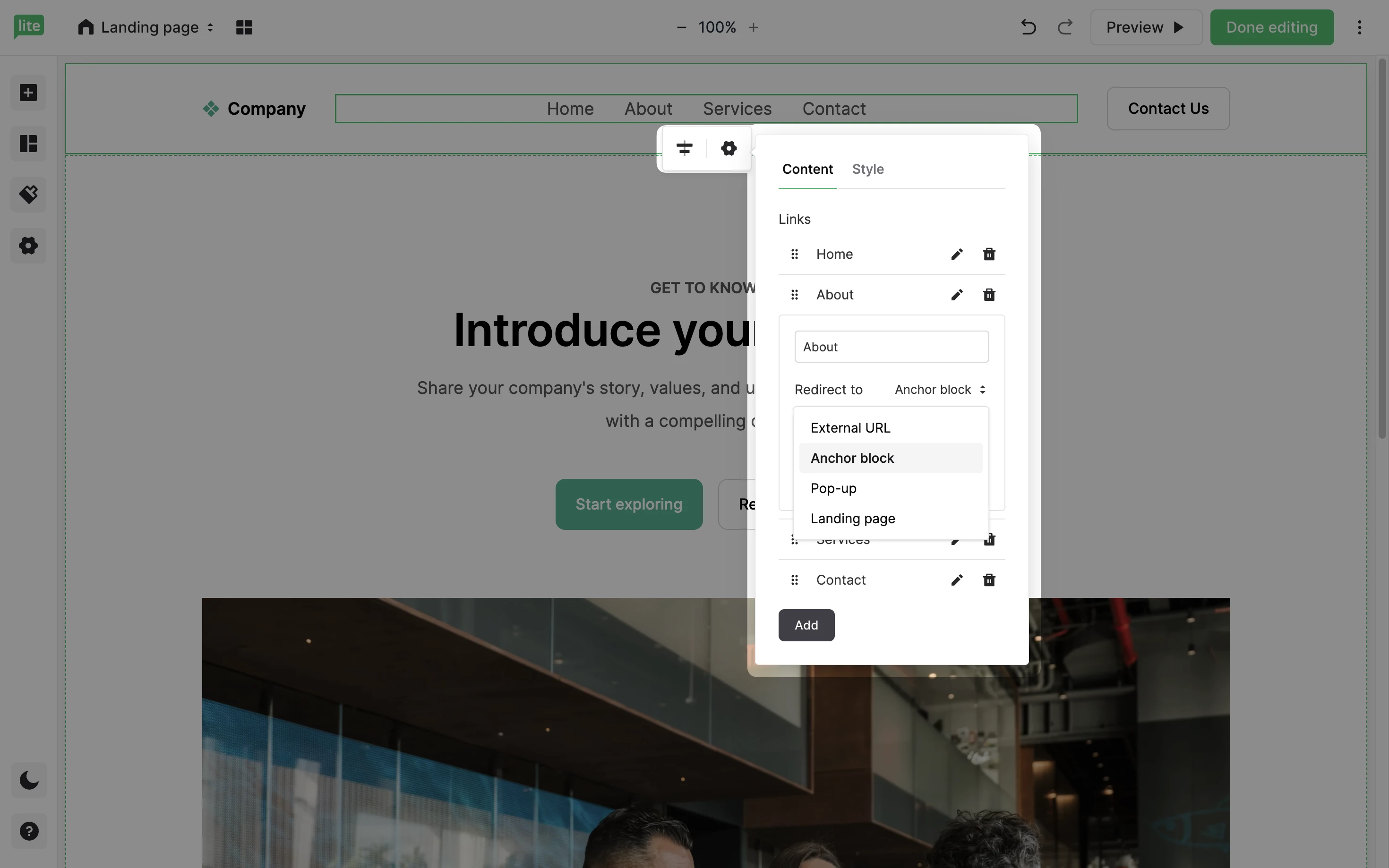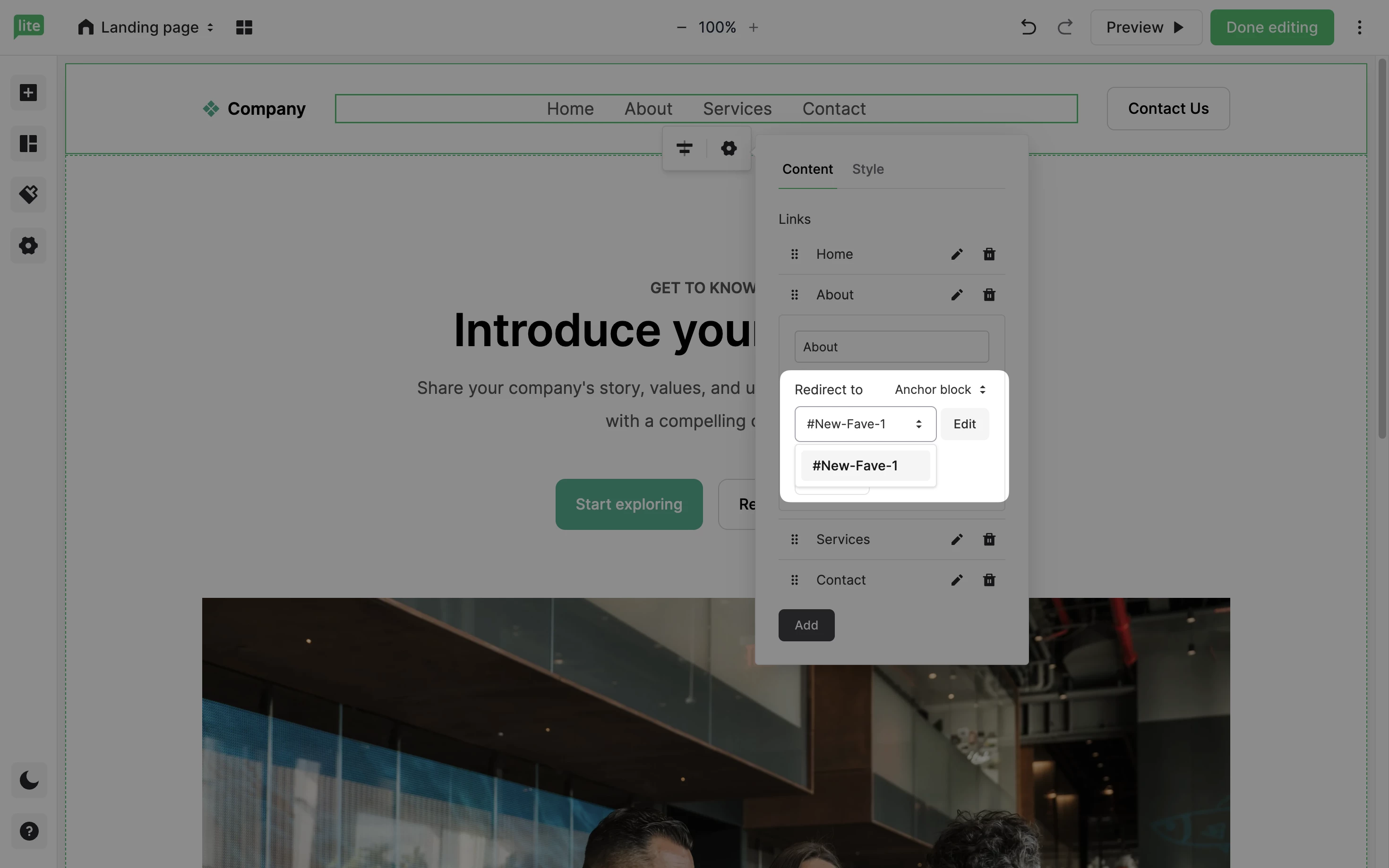 8. Click Add to create the anchor link. Now when that menu item is clicked, it will automatically direct the reader to that specific block in the landing page