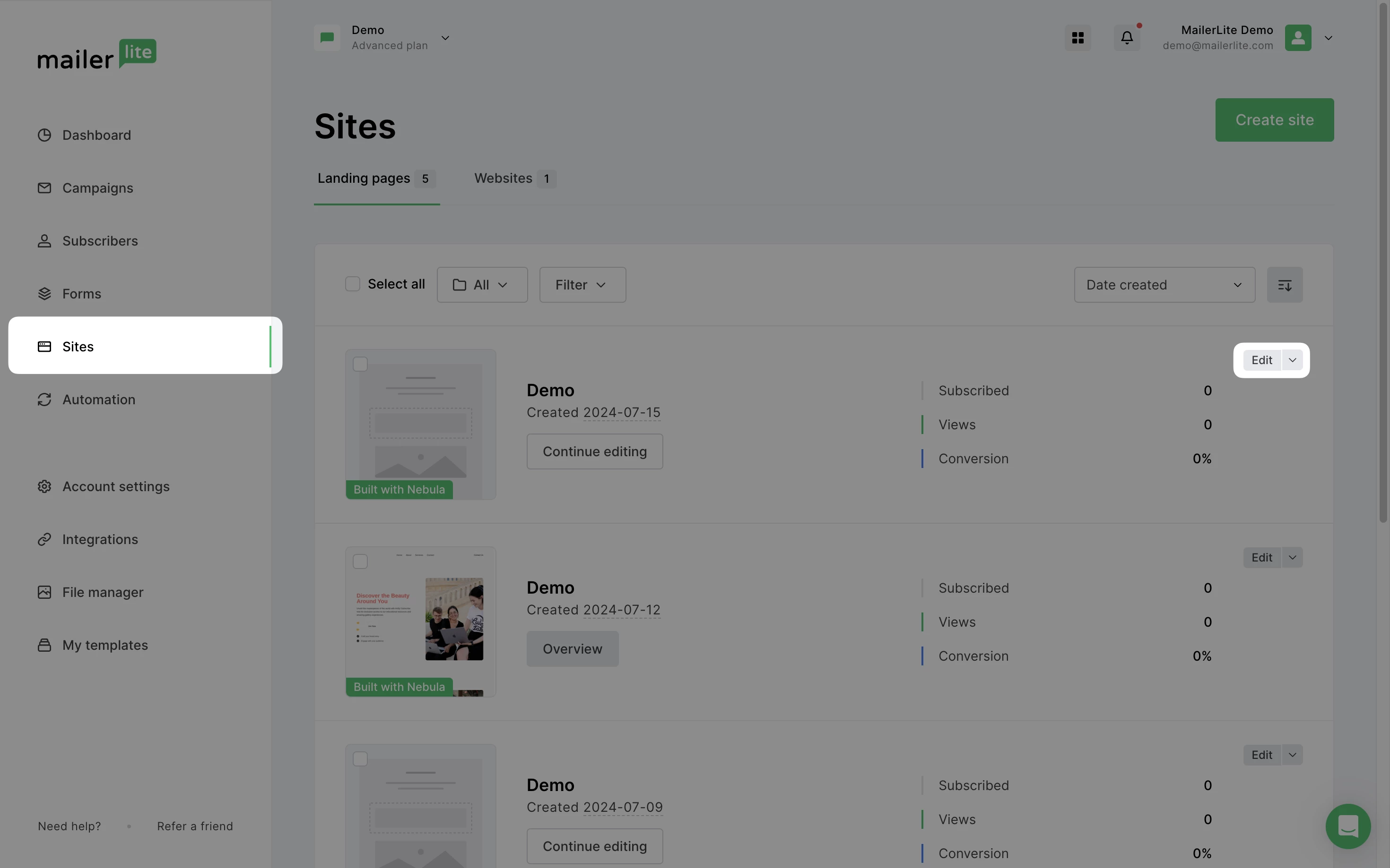 Locate your landing page and click Edit to open the Drag & drop editor.