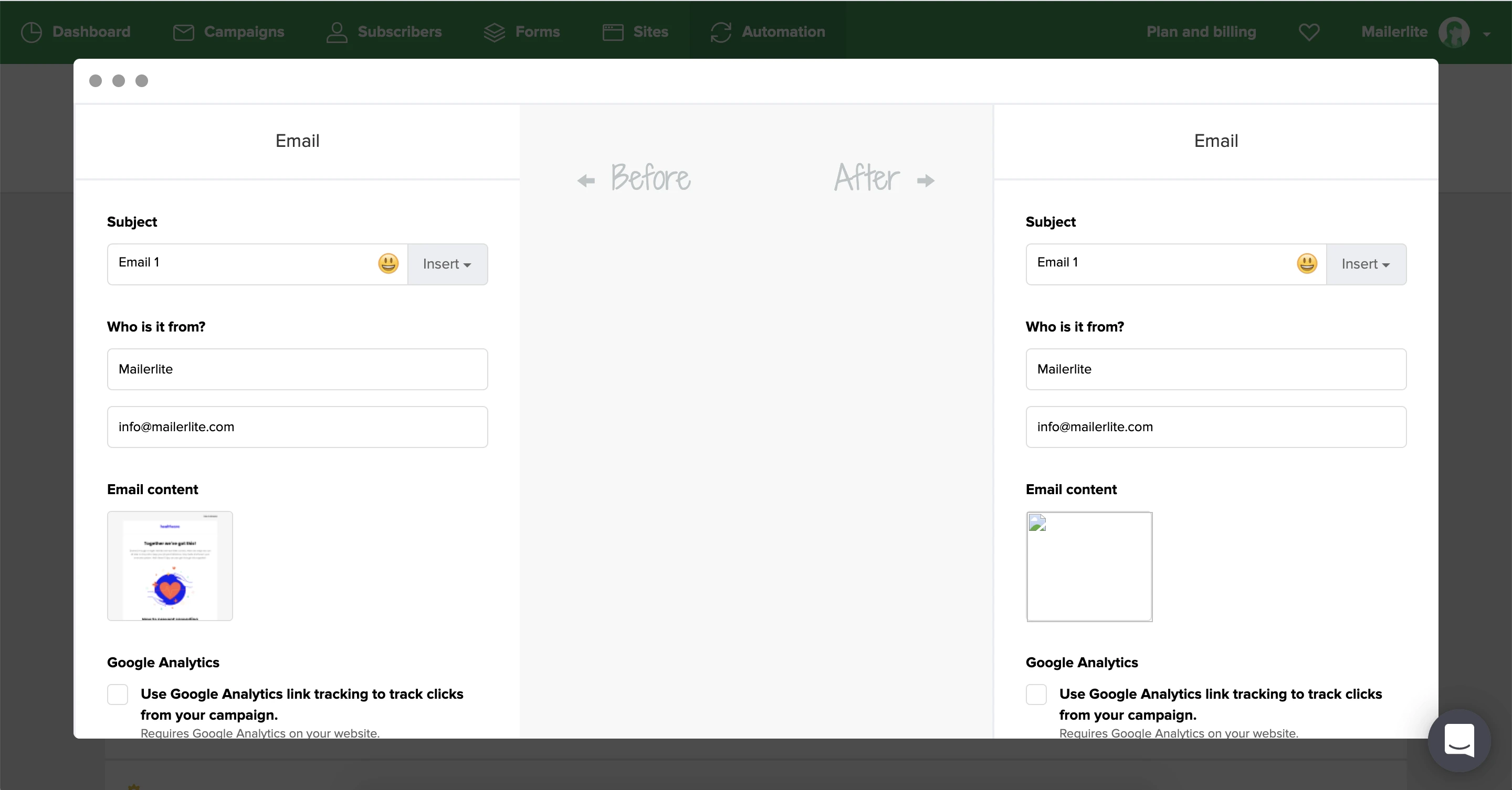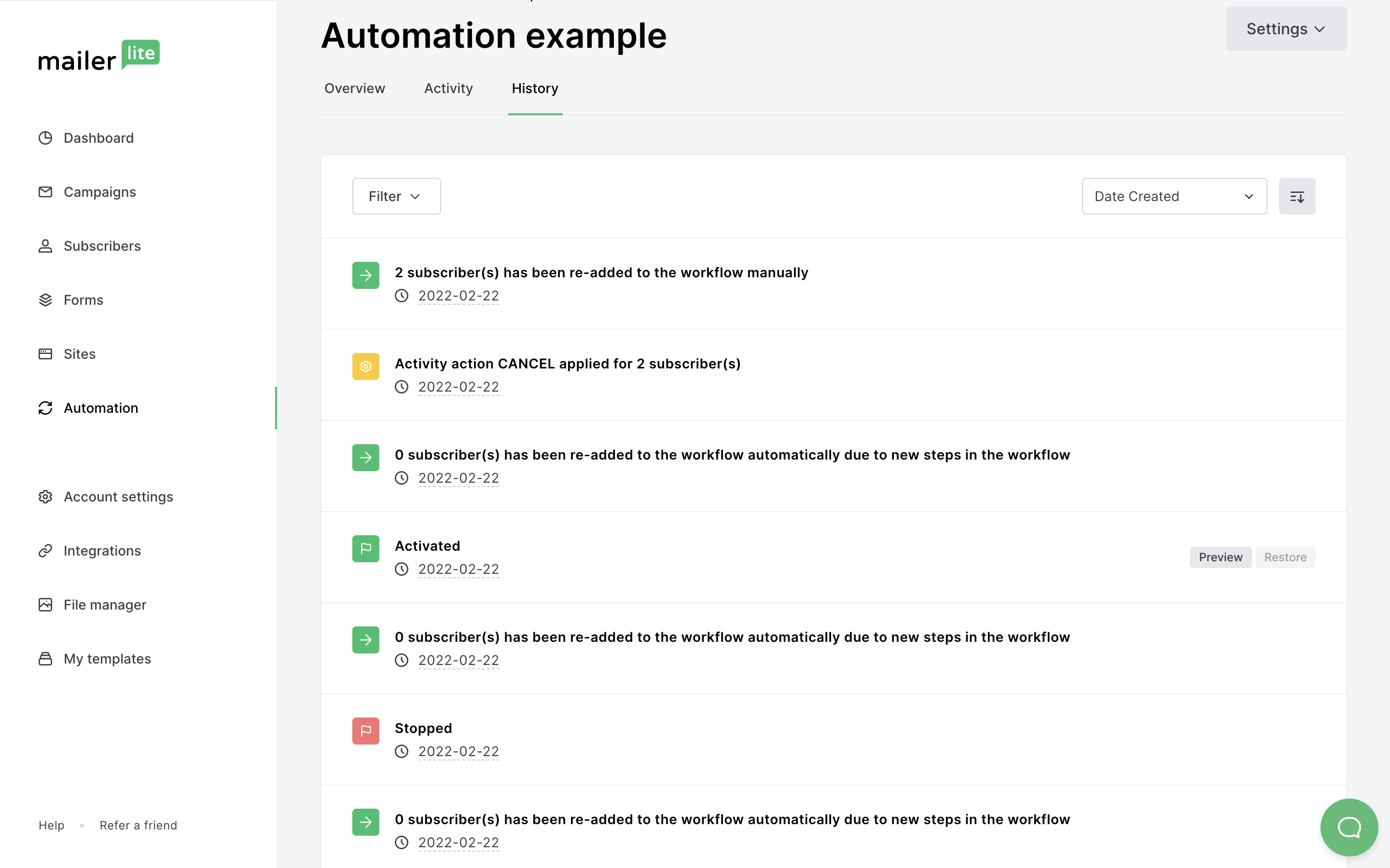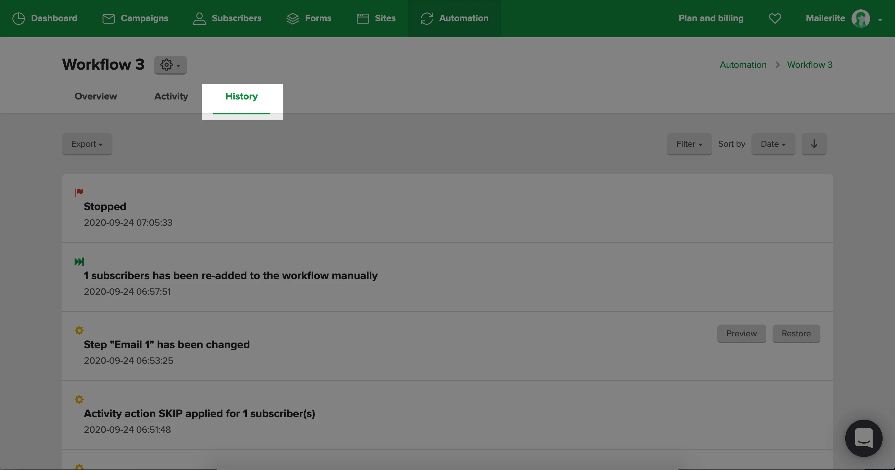 Automation history allows you to track, review and restore changes made to the steps in your automation sequence, as well as when the automation was turned off/on.