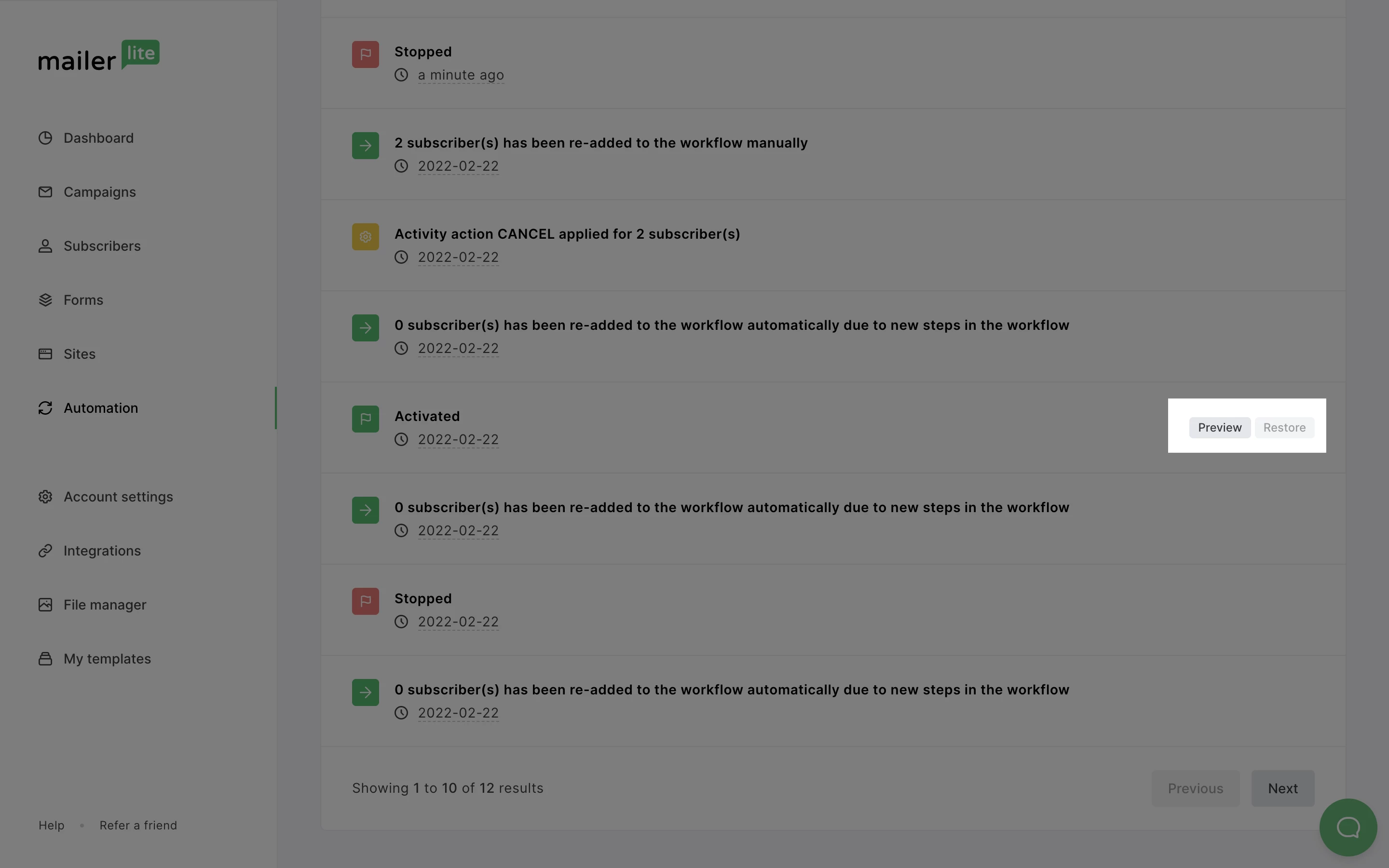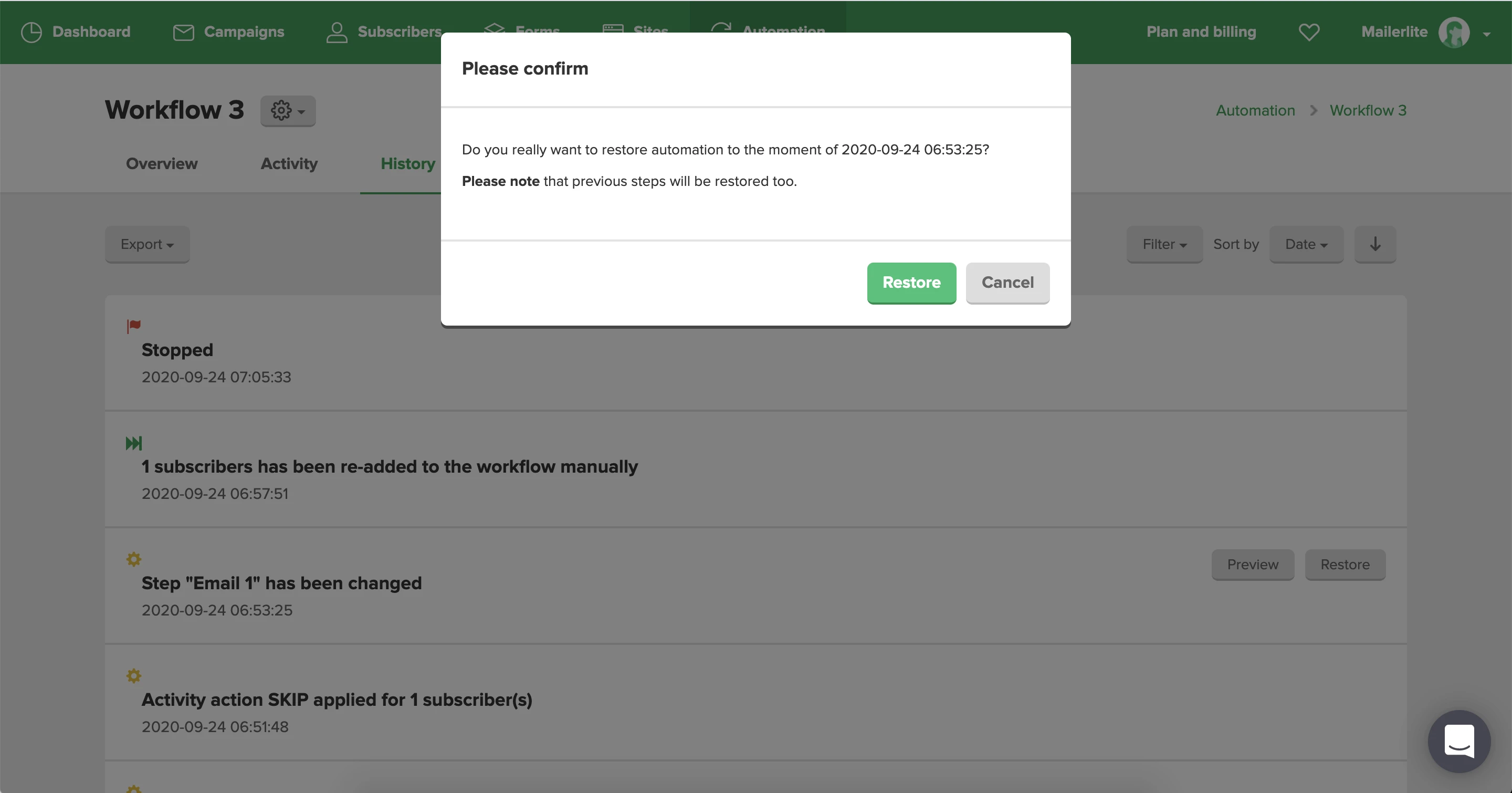 For example, if a subscriber is on a step that no longer exists after restoring, the subscriber will be canceled from the workflow. Not to worry though! You can re-add subscribers to the workflow in the automation activity tab.