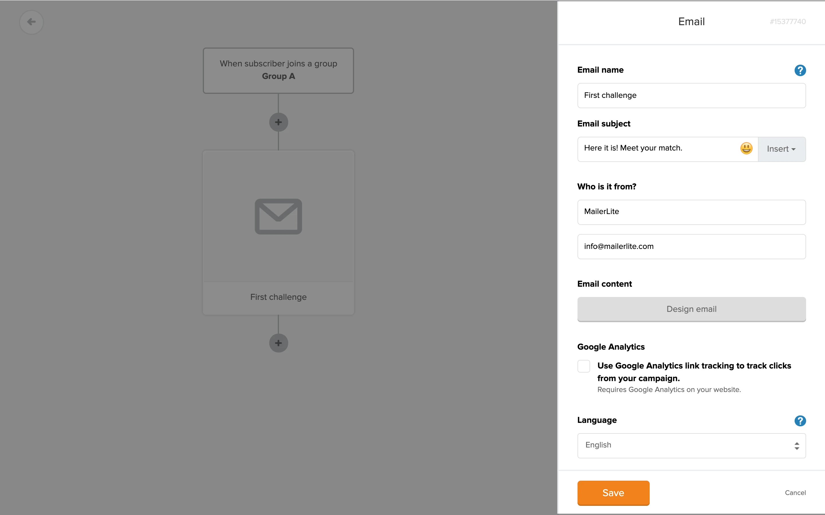 In the right sidebar, enter the email subject and the sender information. You can also enable Google Analytics and select the language of your email.