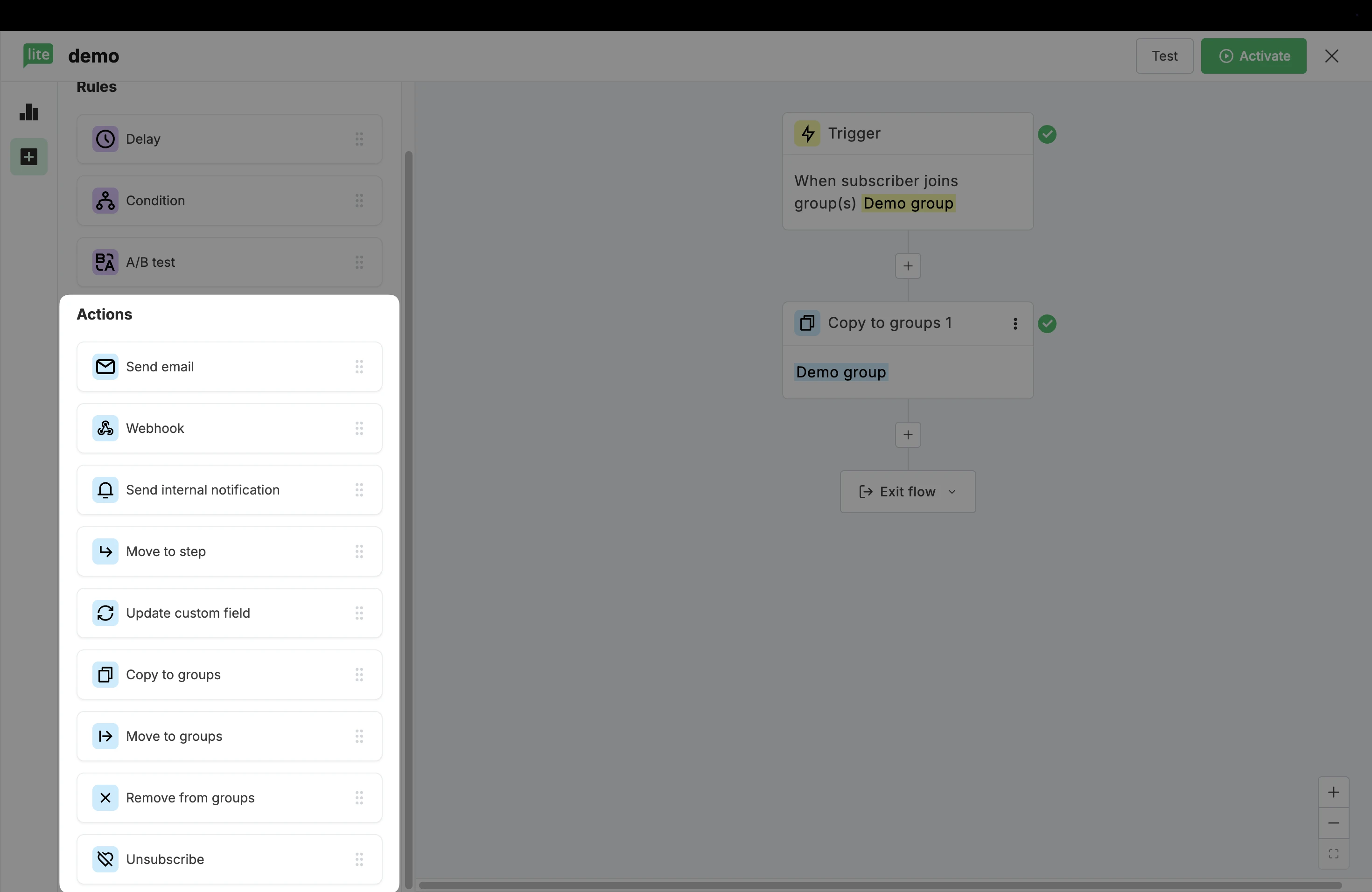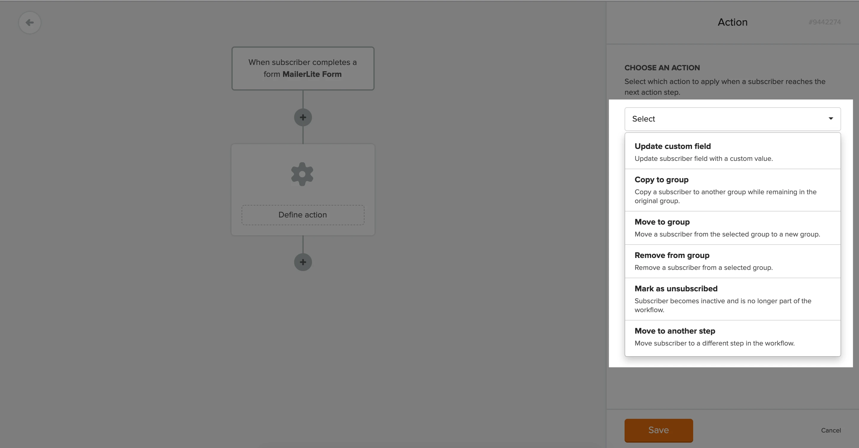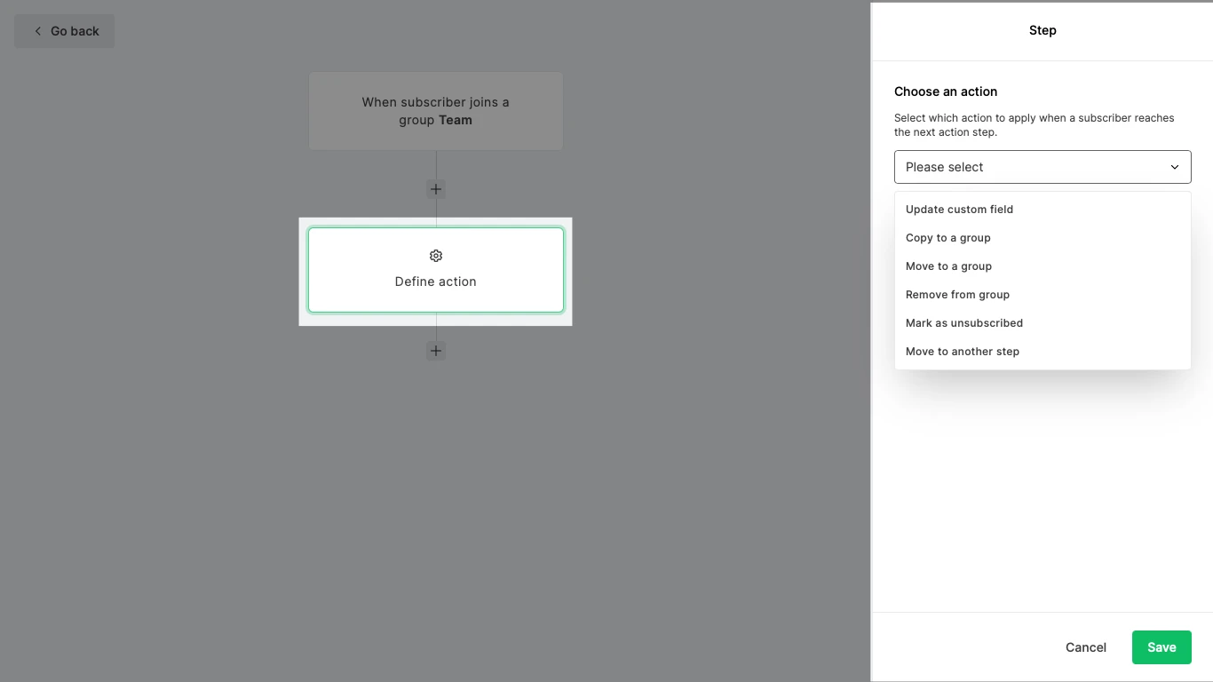 Actions define what happens to subscribers as they move through the workflow. These steps are initiated immediately when a subscriber reaches that step.