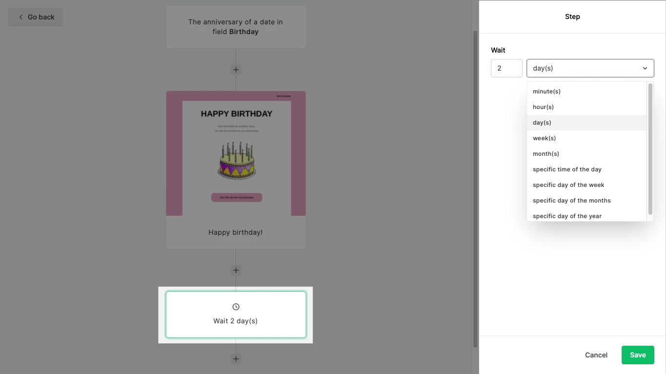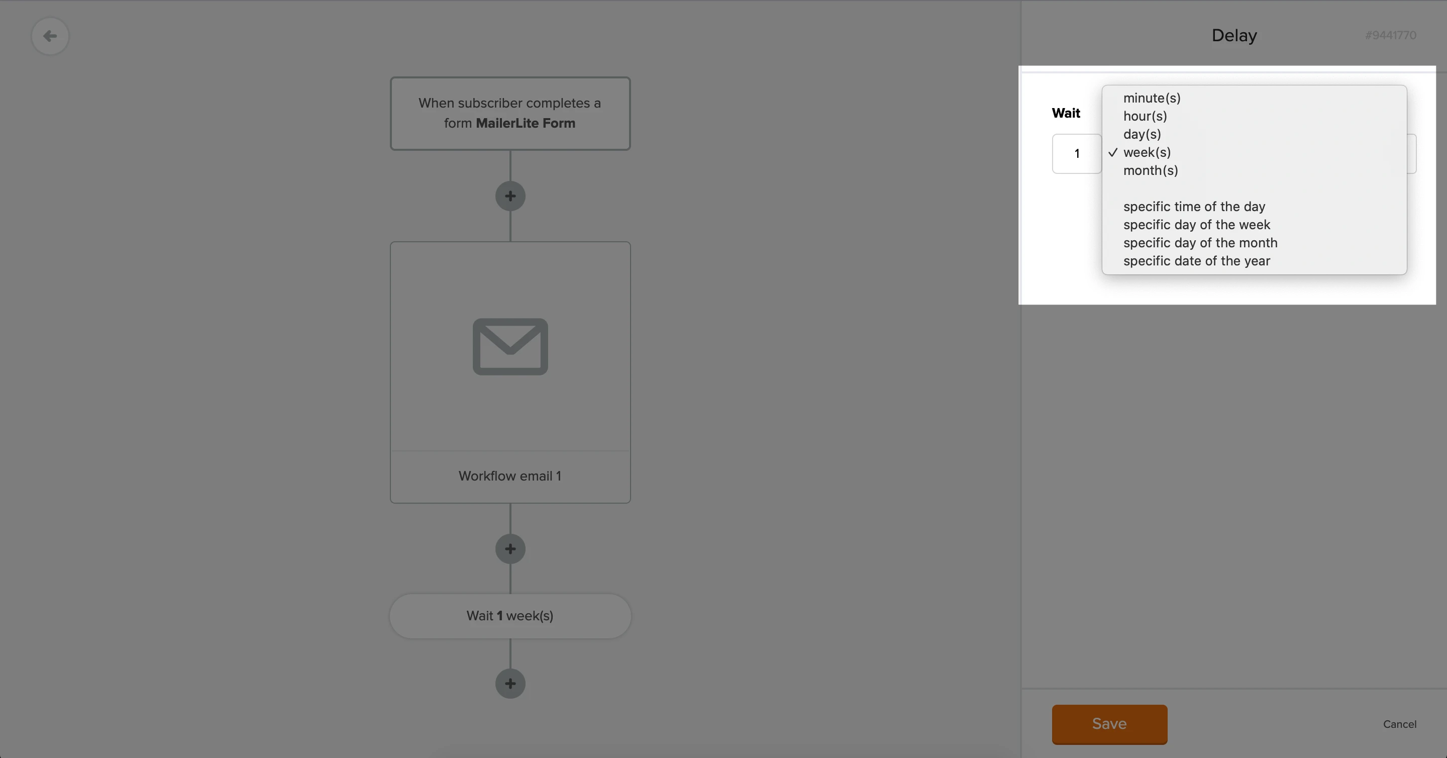 In the sidebar, use the drop-down menu to determine the length of the Delay step.