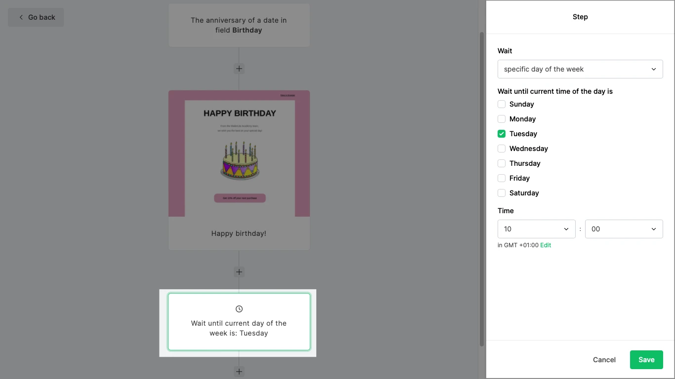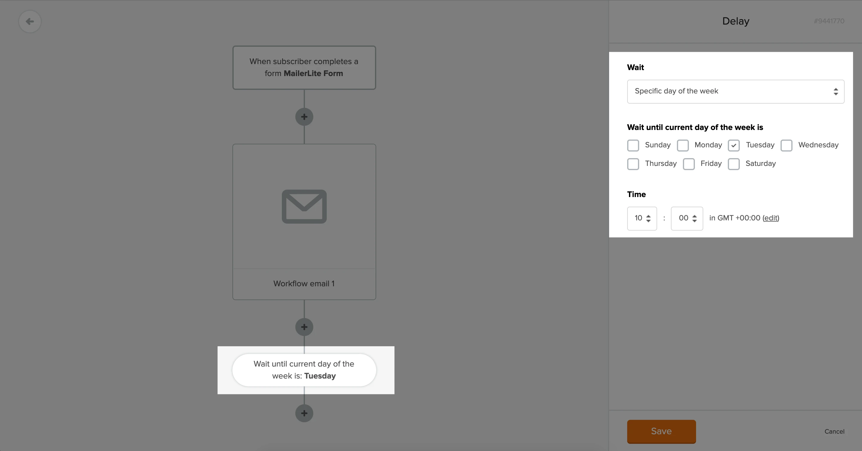 For example, if you want your subscribers to receive their automation emails on Tuesdays only, you can add a specific day of the week: Tuesday Delay step before each email.