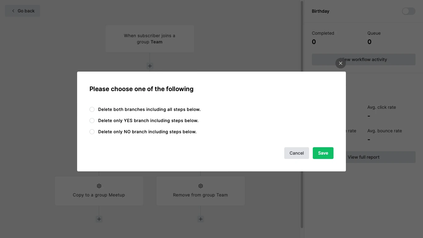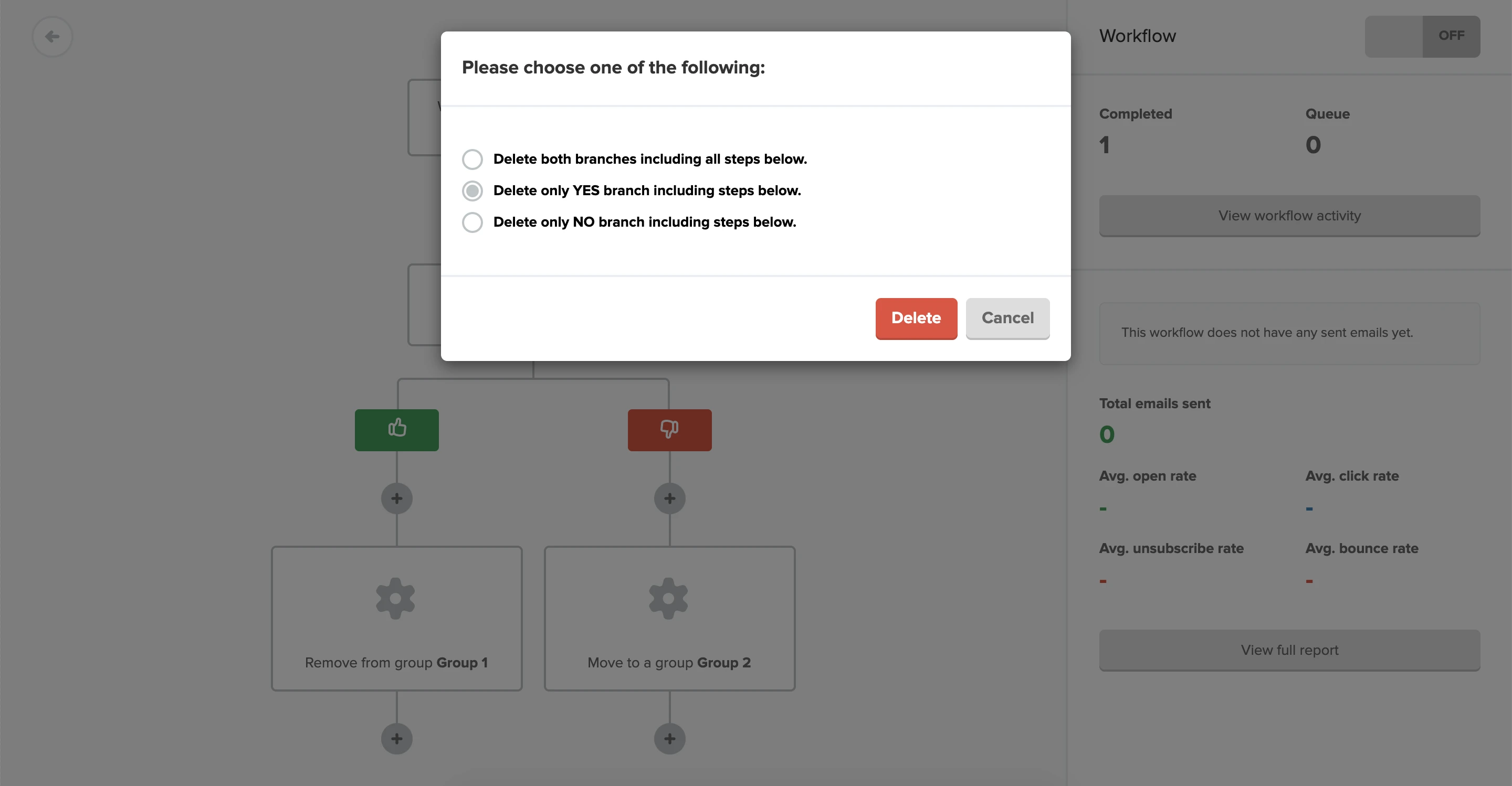 When deleting a Condition step that has active steps under both branches, a pop-up will appear asking to select which branches to delete – the YES branch (thumbs-up), the NO branch (thumbs-down), or both.