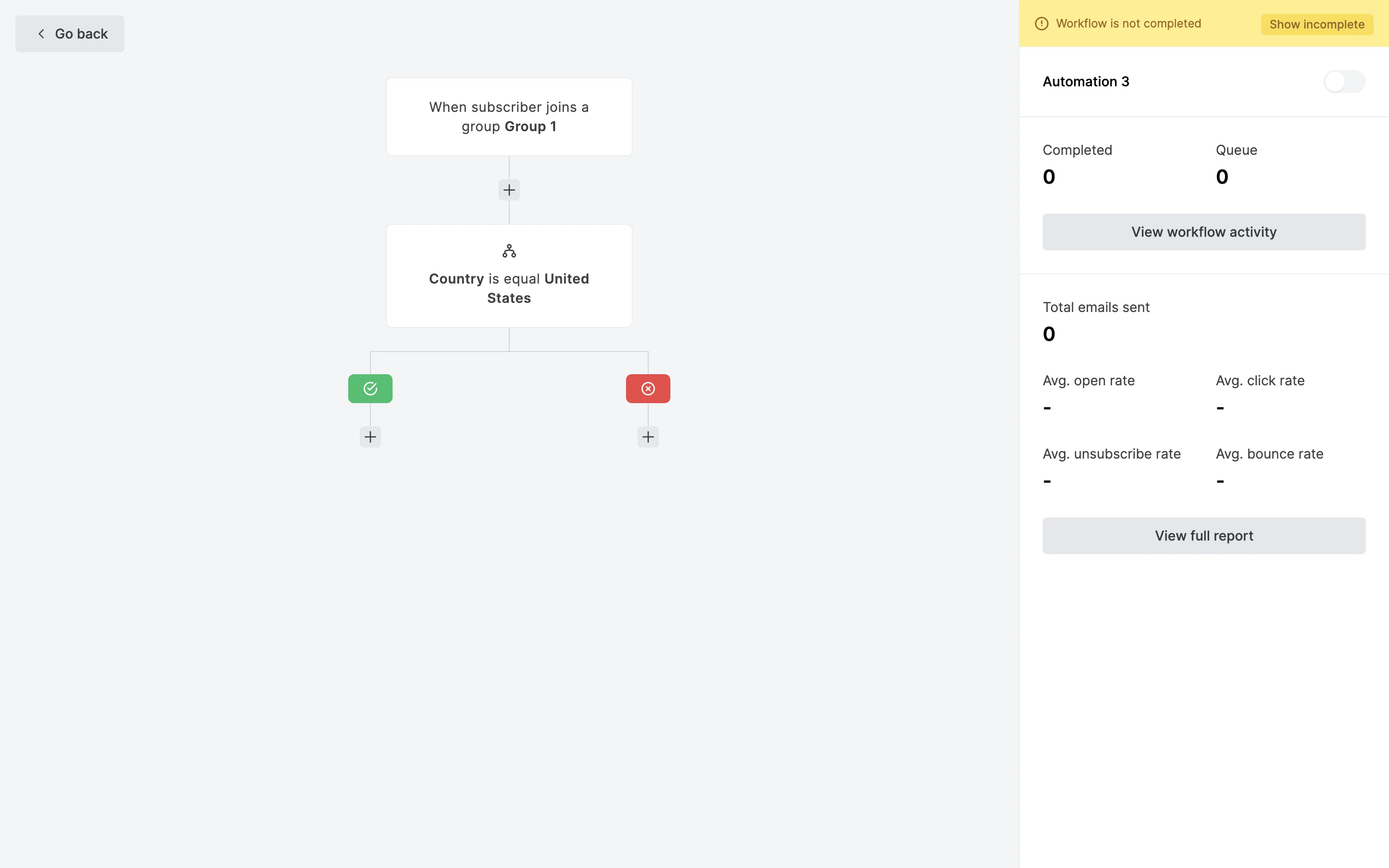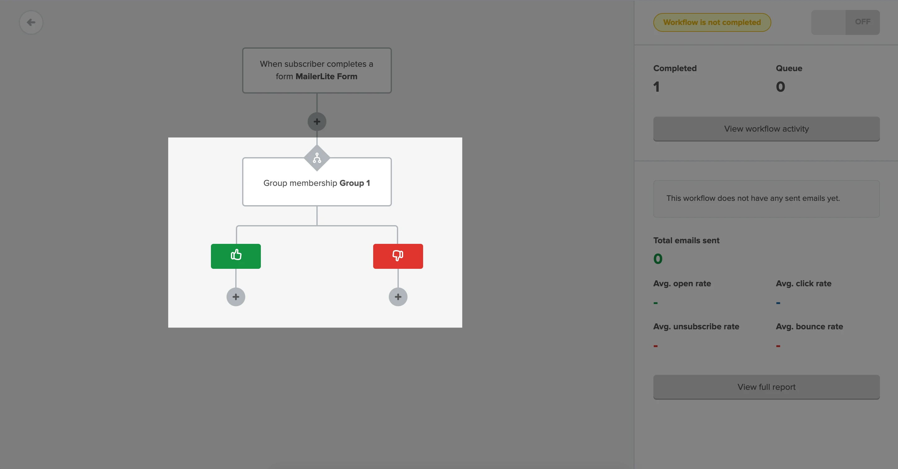 If the condition is true for subscribers, they will continue down the thumbs-up branch. If the condition is false for subscribers, they will continue down the thumbs-down branch. Each branch will have its own plus (+) icon that you can click to add more steps.