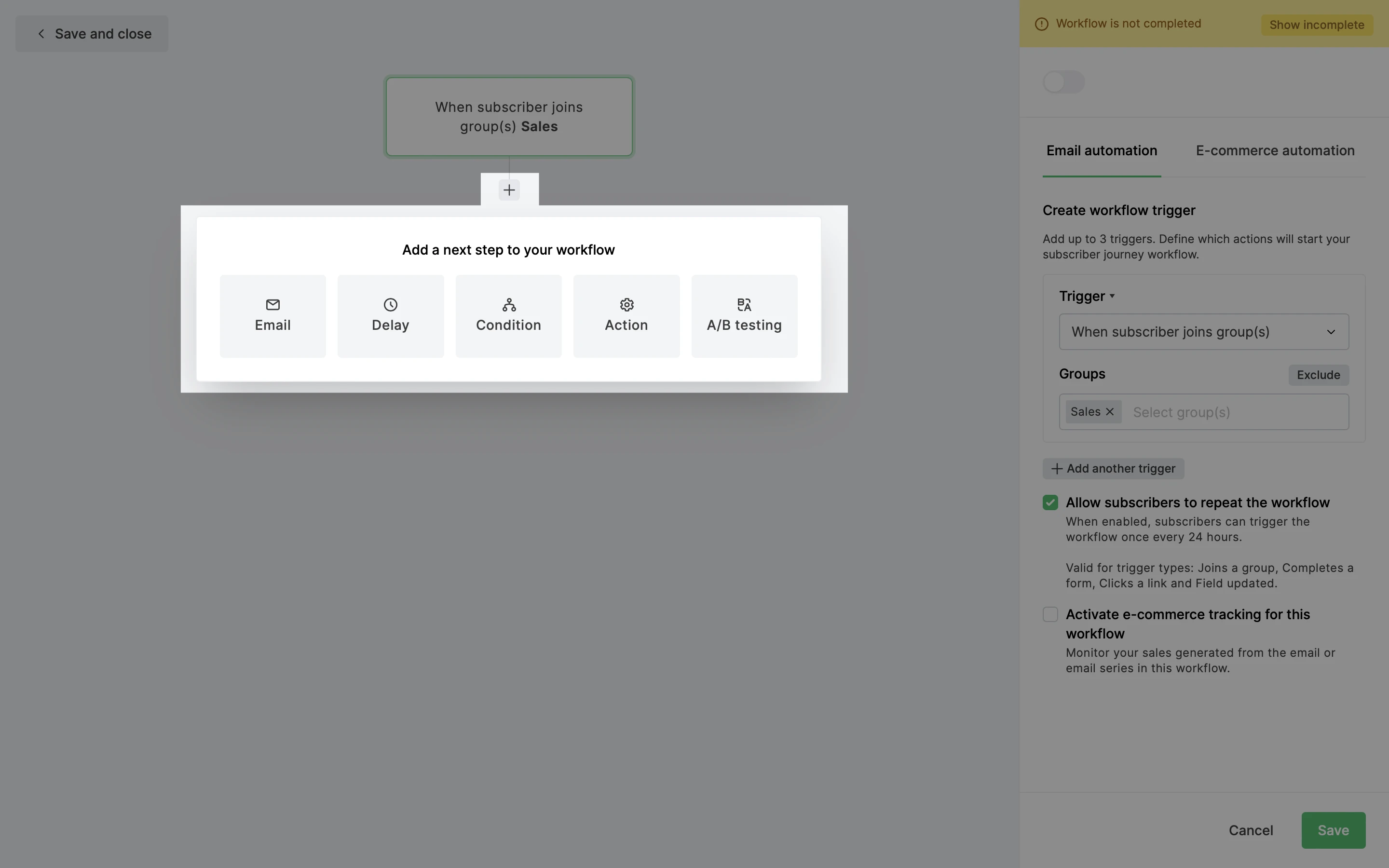 6. Once you’re happy with your split test, click the single + icon to continue building your workflow.