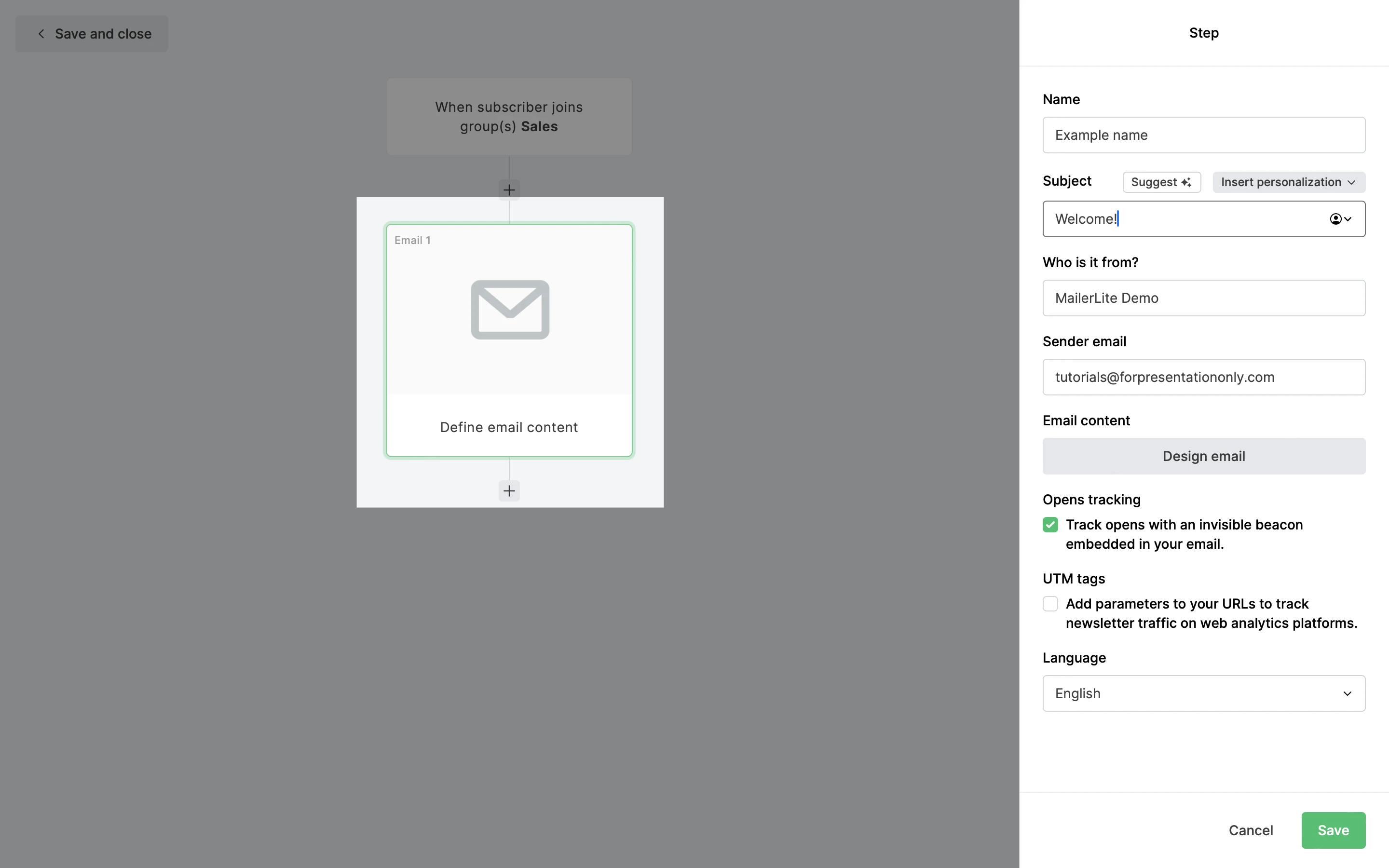 The Send email action allows you to add an email to your workflow that will be sent out automatically when subscribers reach that step. This could be a welcome email, freebie email, or even an automated birthday email, for example.