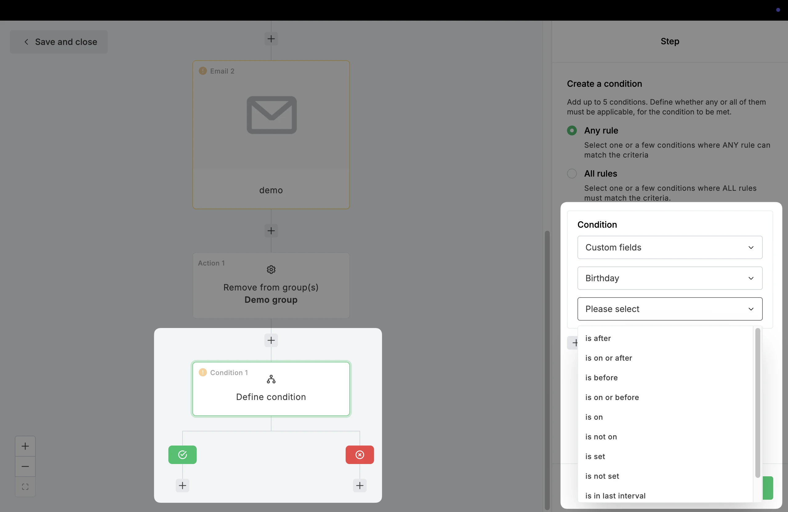 You can set up to five conditions (rules) within a Condition step. If you select Any rule, then a subscriber only needs to adhere to at least one of those rules in order to successfully meet the requirements of this step.