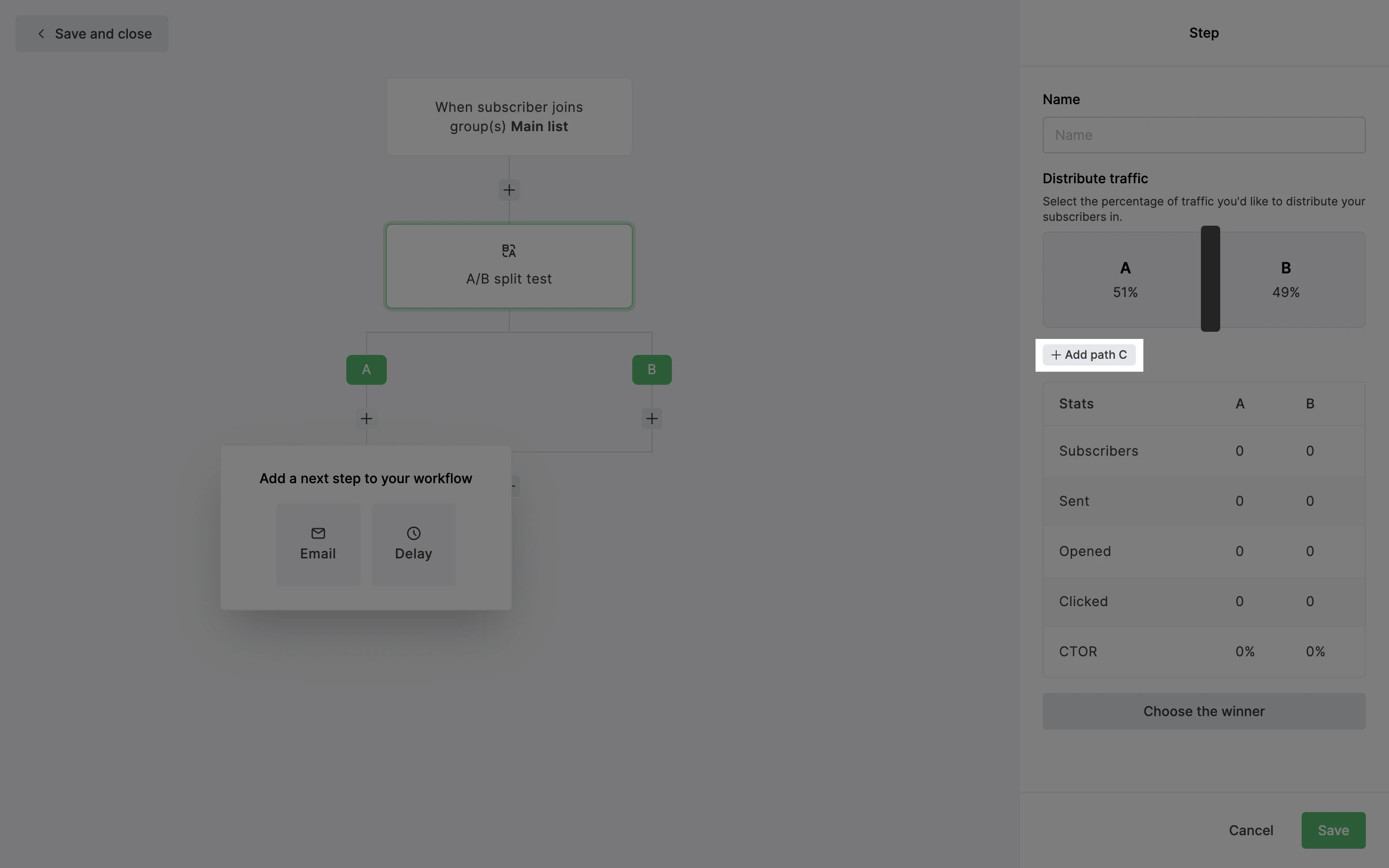 The A/B split testing step allows Growing business and Advanced plan users to split-test certain elements of their workflows. With A/B testing for automation, you can test up to 3 versions of Delay and Email steps.