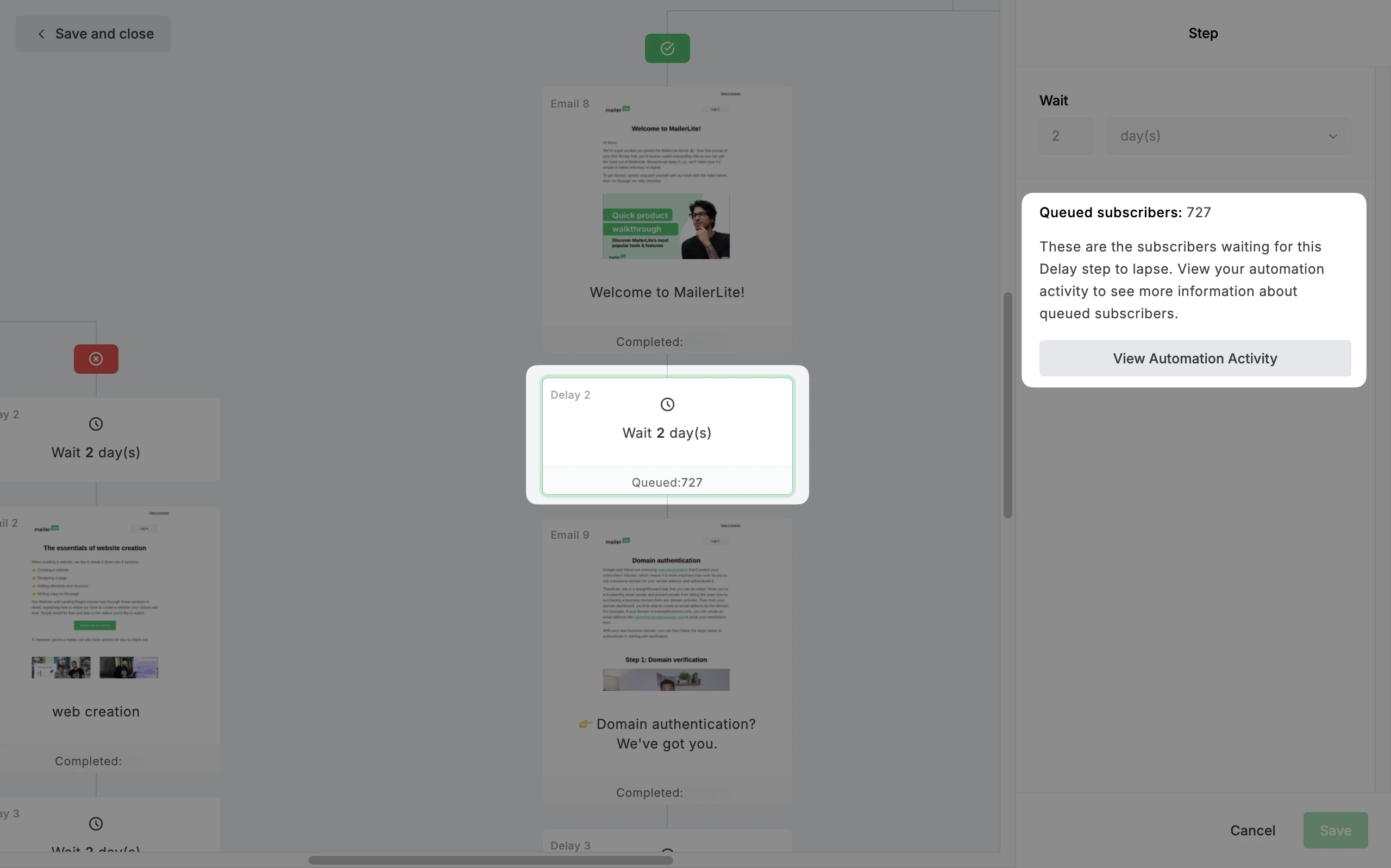 Clicking on the delay step will show more information, and selecting View automation activity will take you to the automation's Activity tab, filtered by the Queued subscribers.