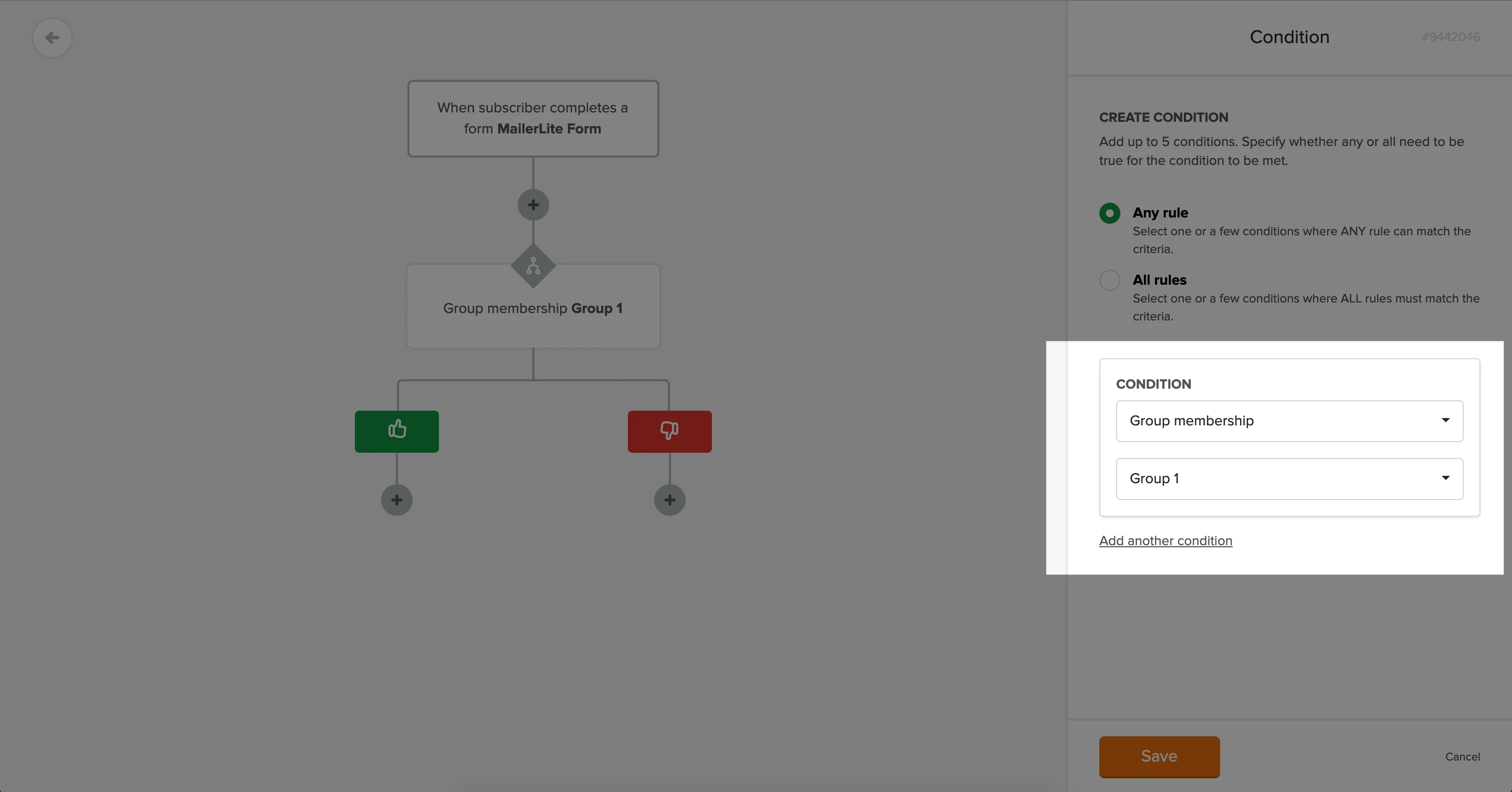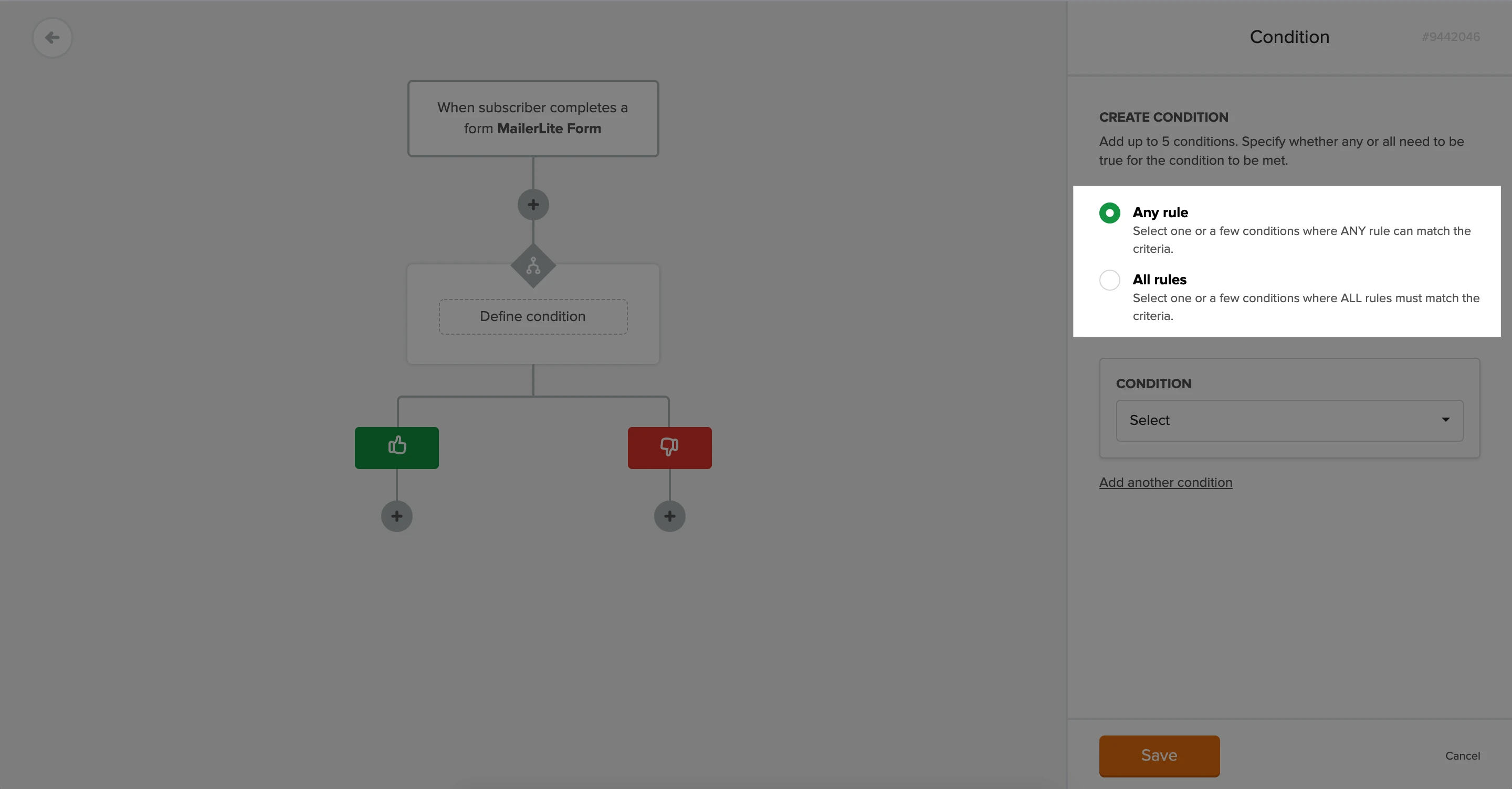 In the sidebar, select whether you want subscribers to adhere to All rules or Any rule in order to meet the requirements of the condition.