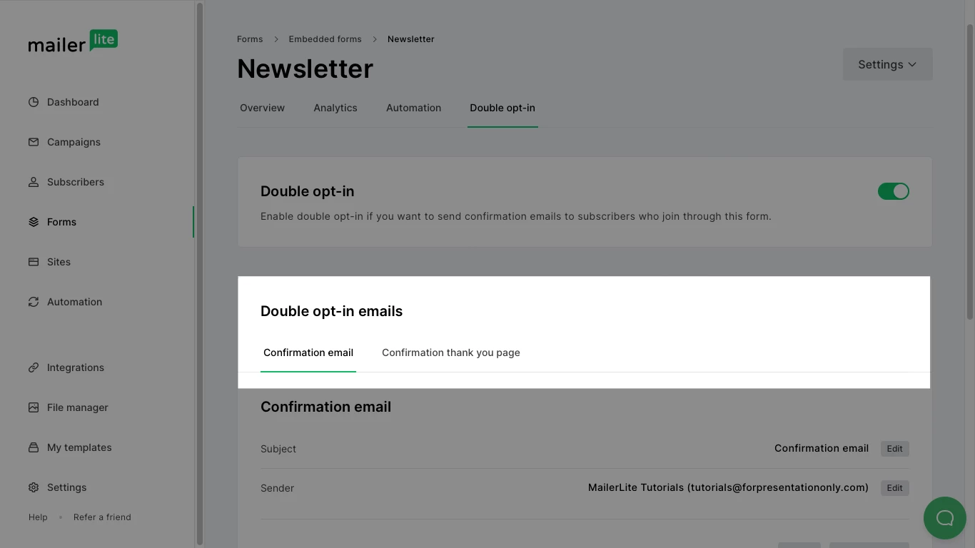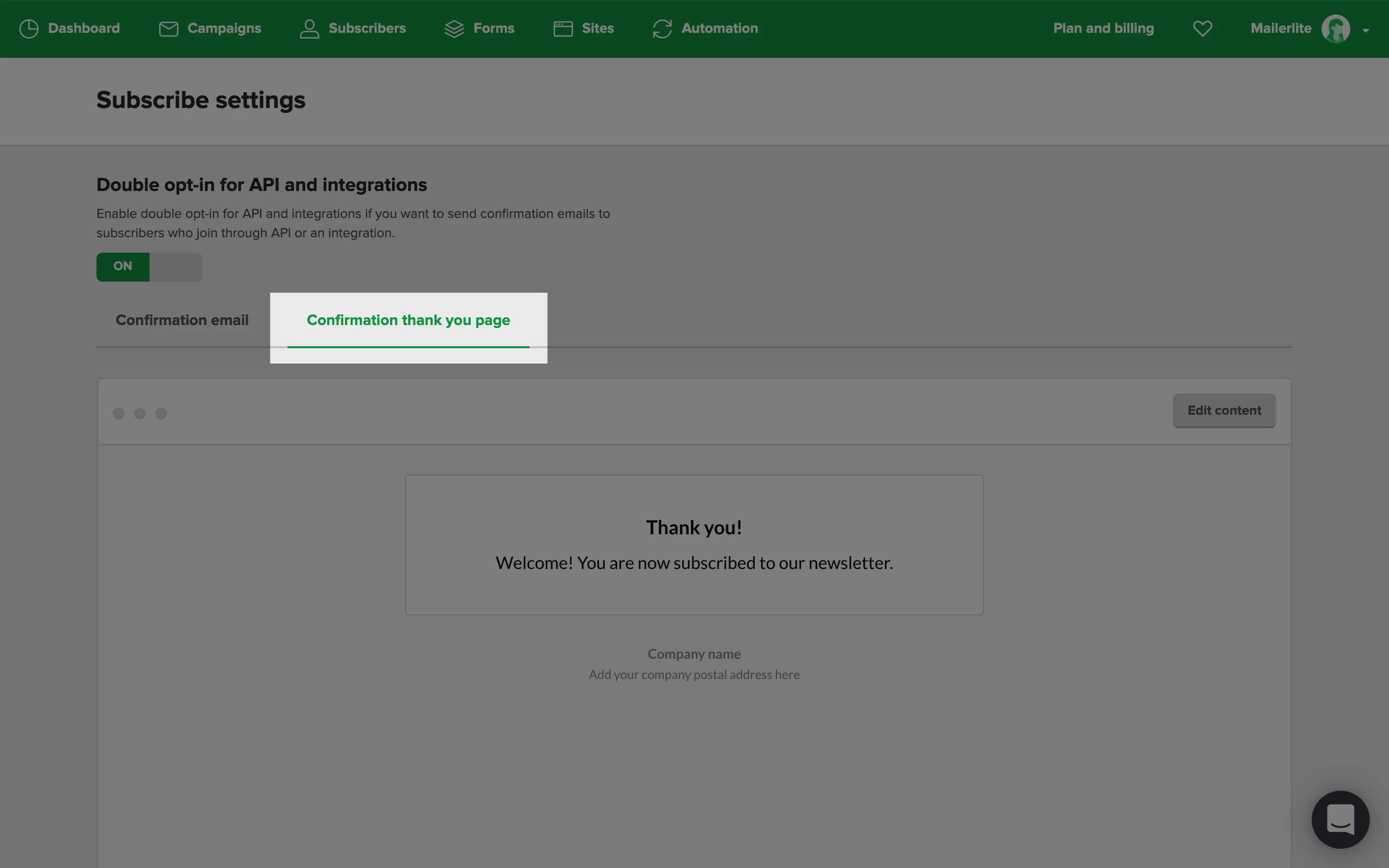 If you wish to customize your double opt-in email, click on the Double opt-in tab. Here, you can edit both the confirmation email and confirmation thank you page separately.