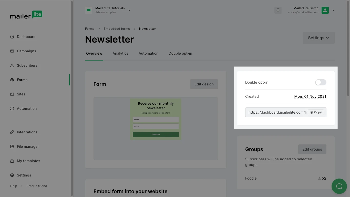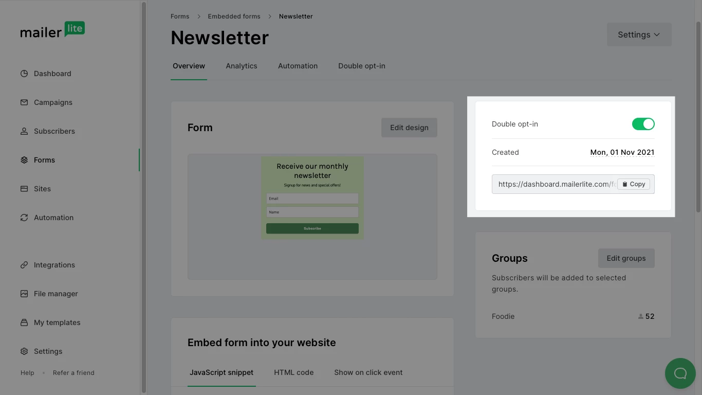When you create a form, double opt-in is already enabled by default. You can enable or disable double opt-in heading to the Overview page of the form and toggling the switch.