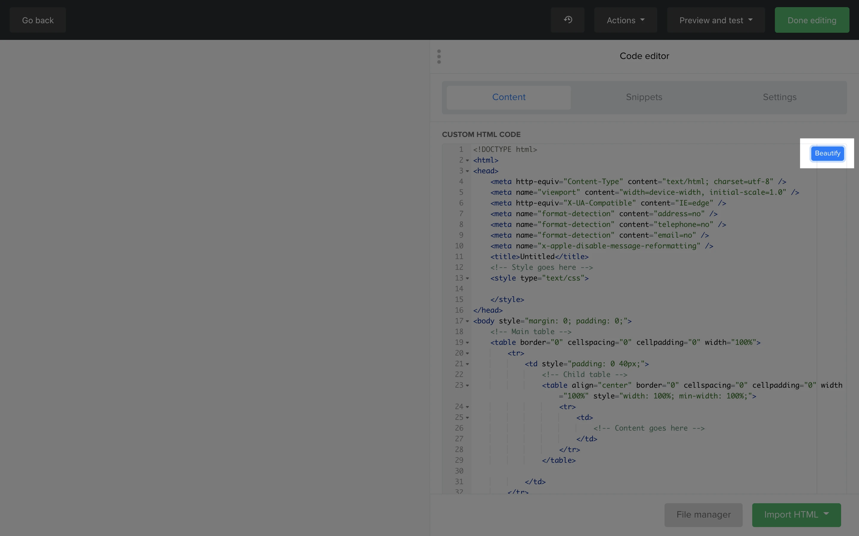 After copying and pasting multiple elements into your newsletter, you may need to clean up your code (for your own sanity). To tidy up your code, simply click Beautify button under the Content tab.