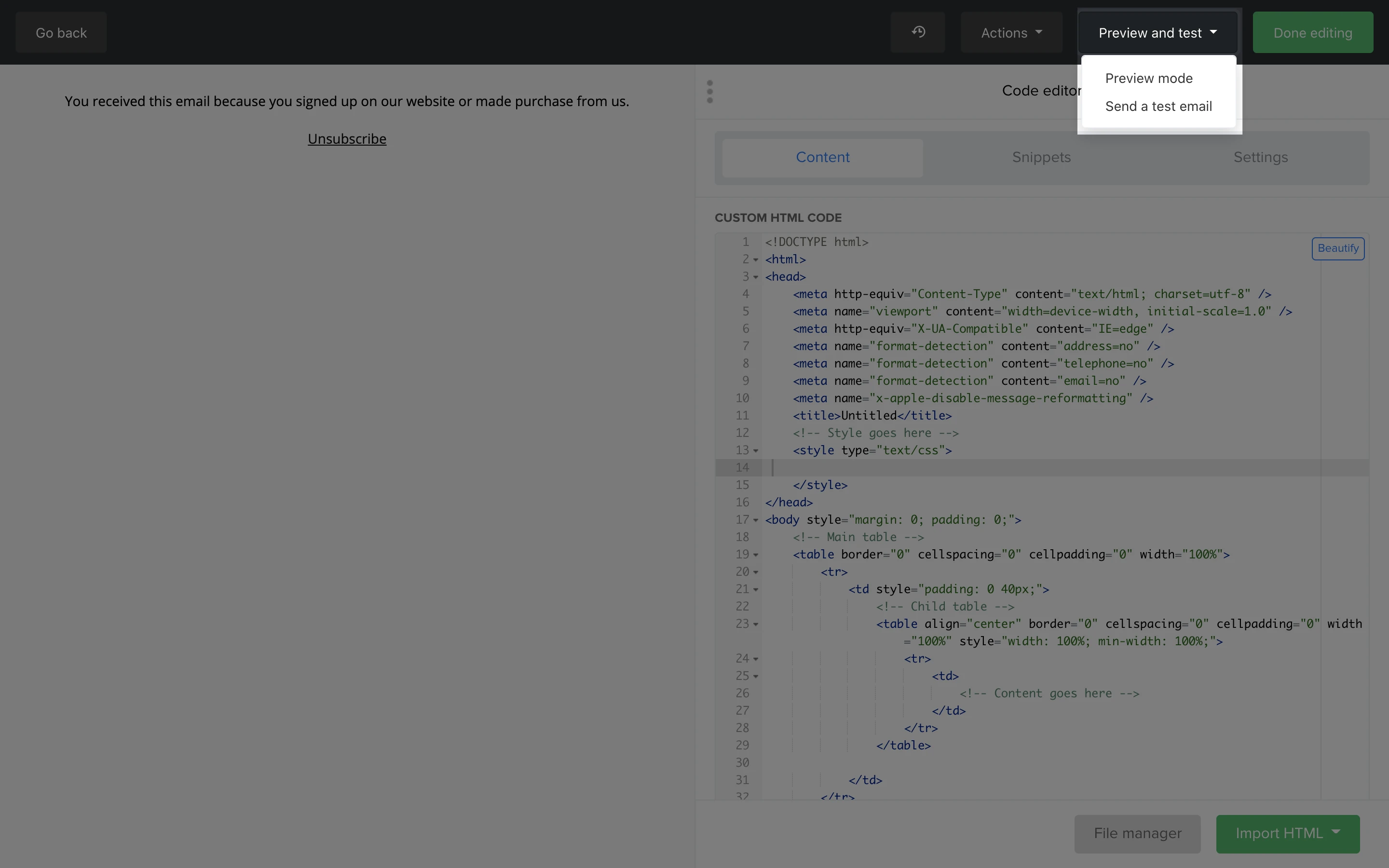 Base - A good starting point for your custom HTML email as it has all the required elements and structure to help you create a fully functional email. If you already know some HTML code, you can simply start creating your email from the Base snippet, and continue building from there.