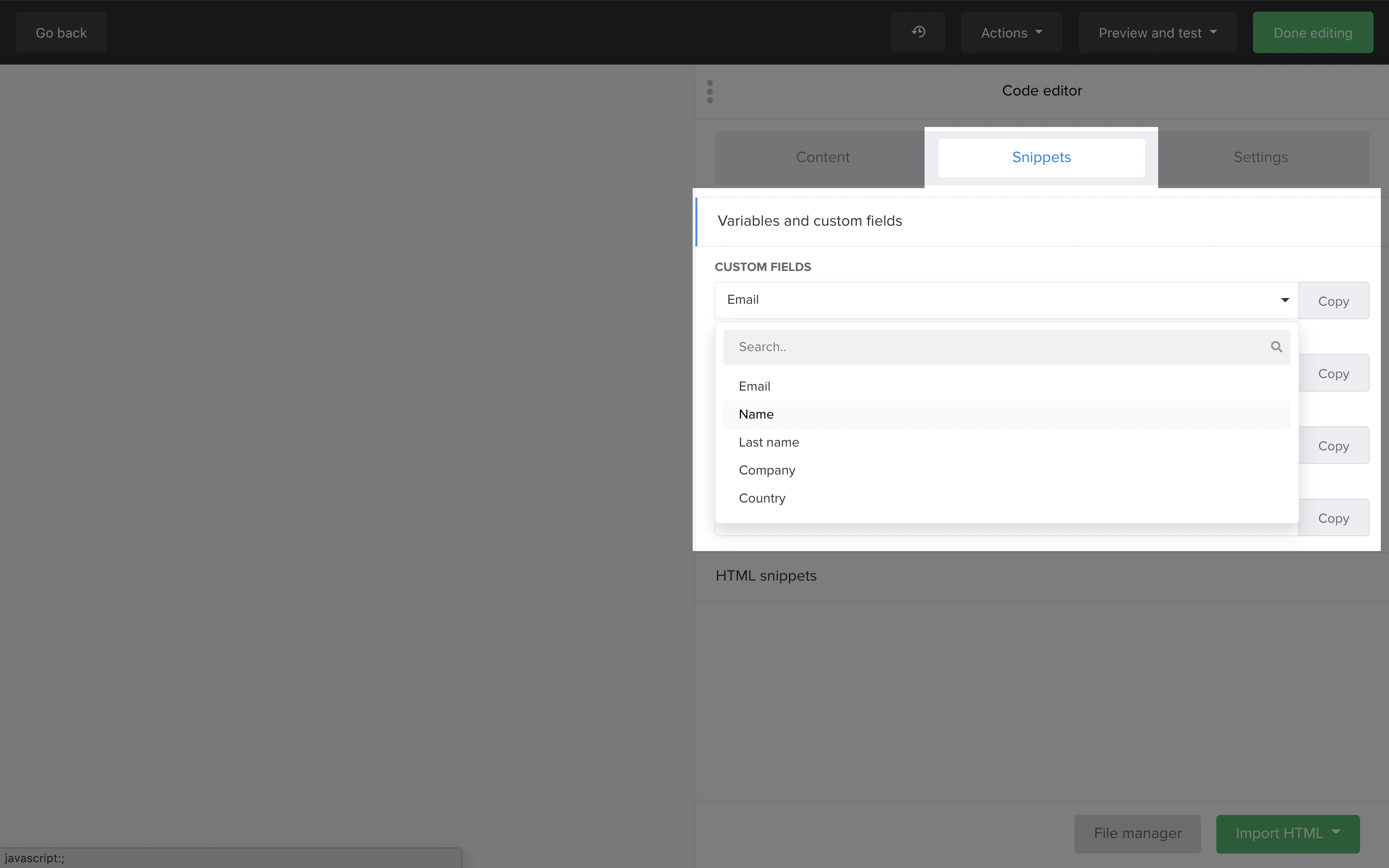Note: If you want to include data that there isn’t currently a field for, you can create your own custom fields. Once your custom field is created, it will appear in the Custom fields dropdown menu in the Snippets tab.
