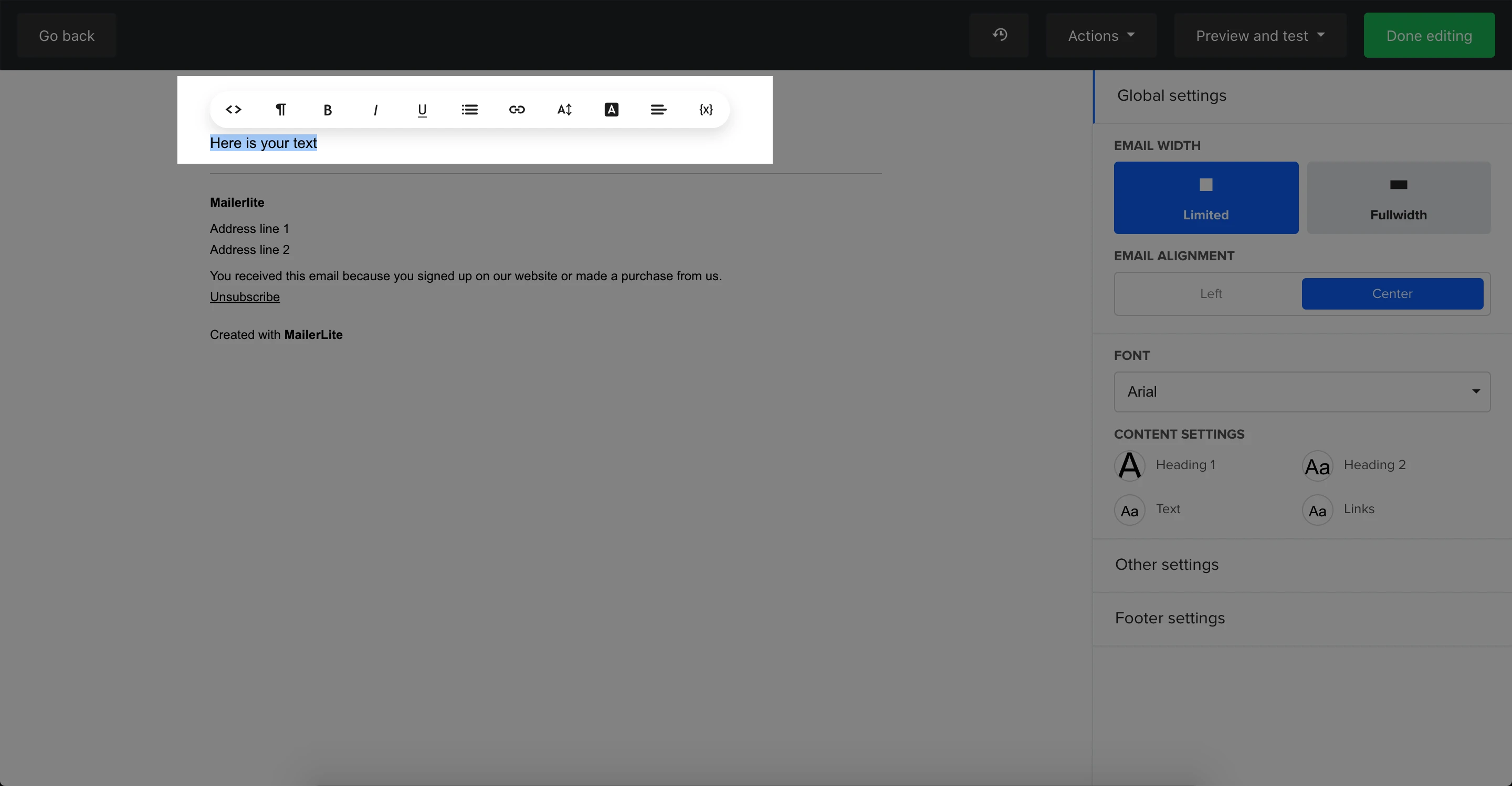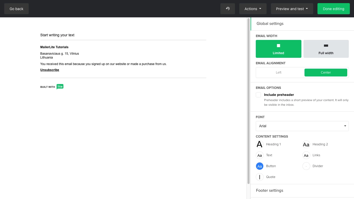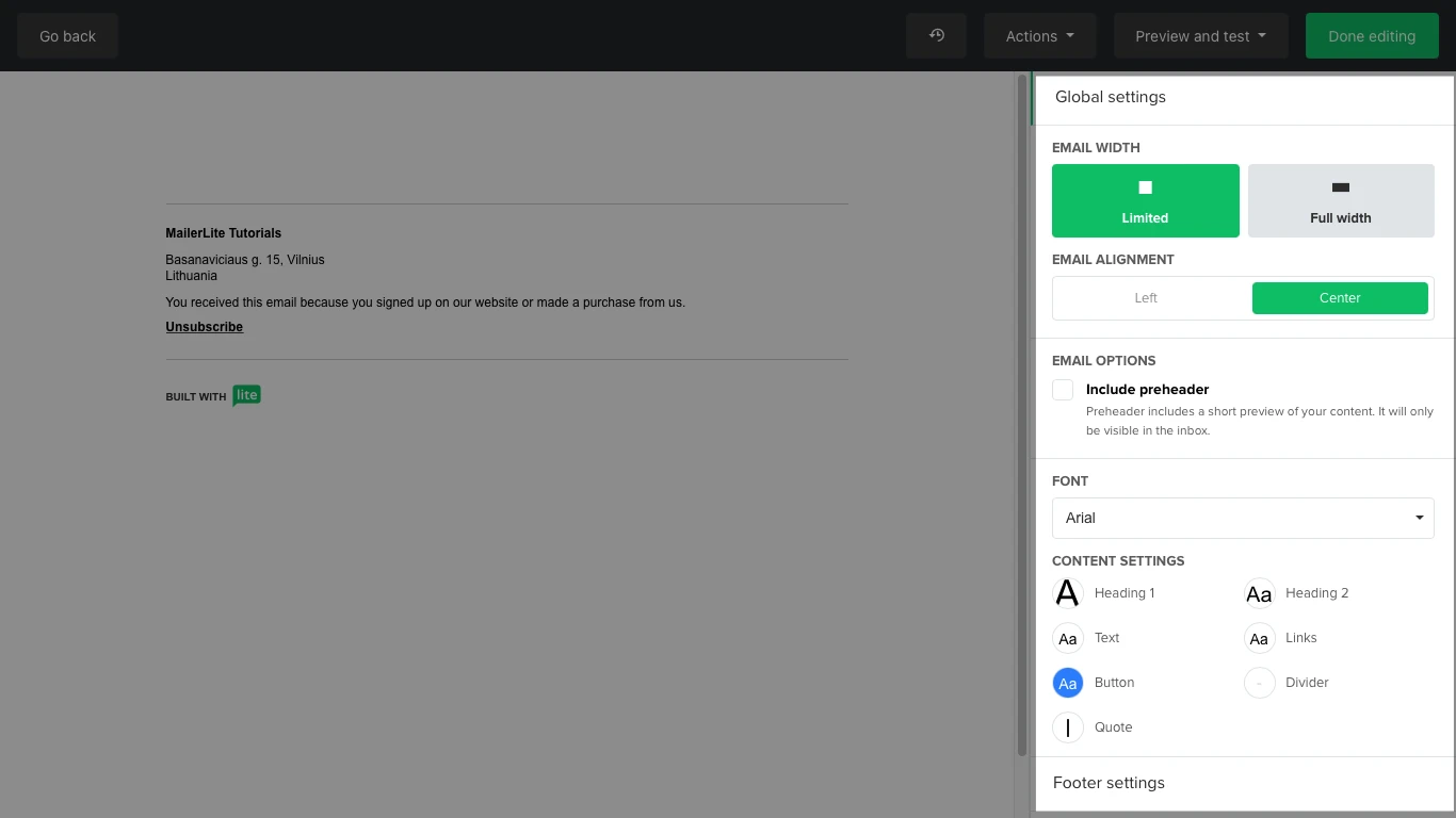 Set the width of the email from full width to limited, and with it, its alignment. You can also set the main font and change the style formats for each type of text content.