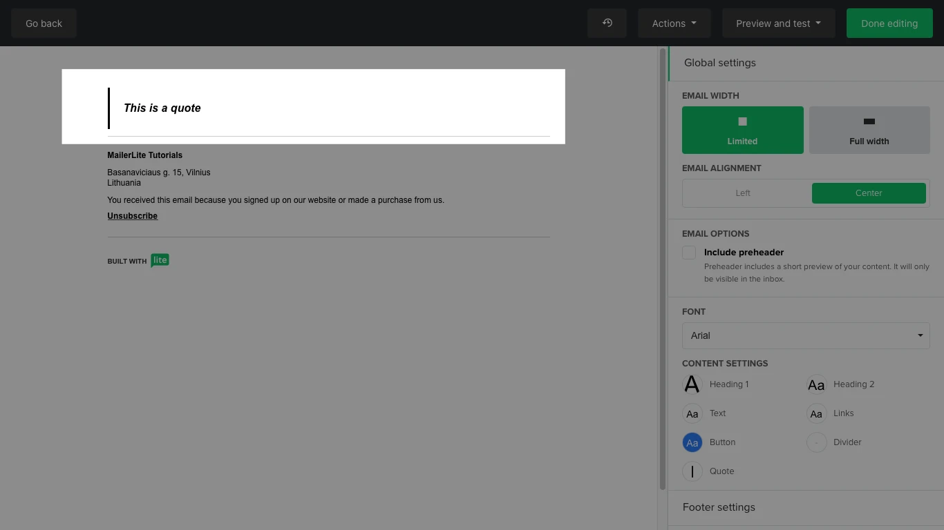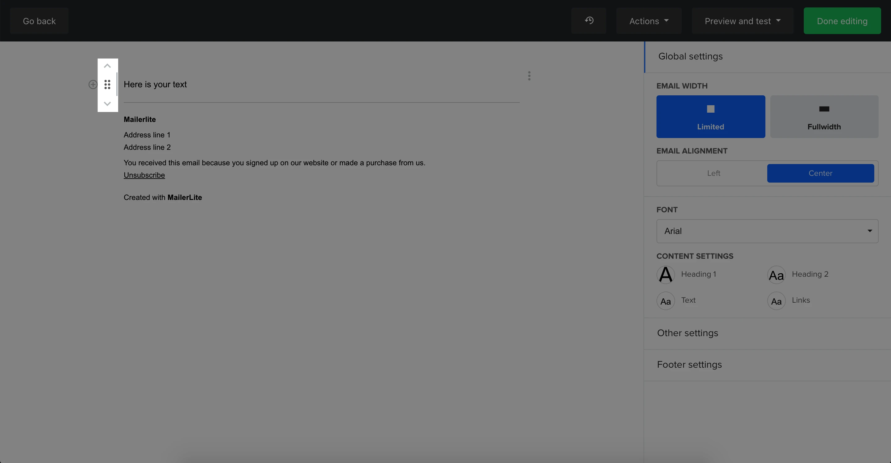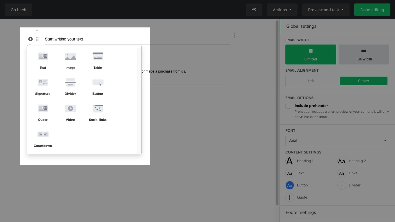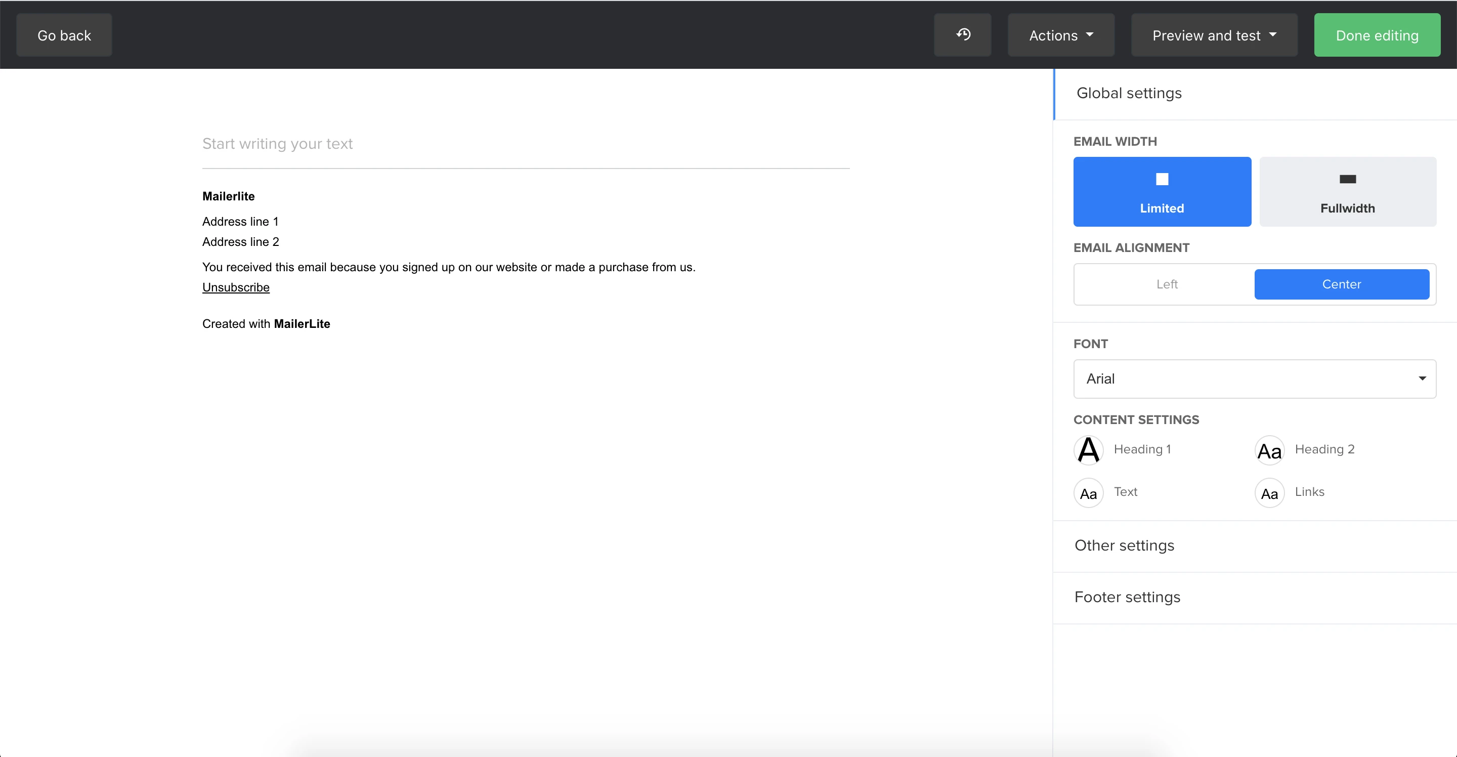 Set the width of the email from full width to limited, and with it, its alignment. You can also set the main font and change the style formats for each type of text content.