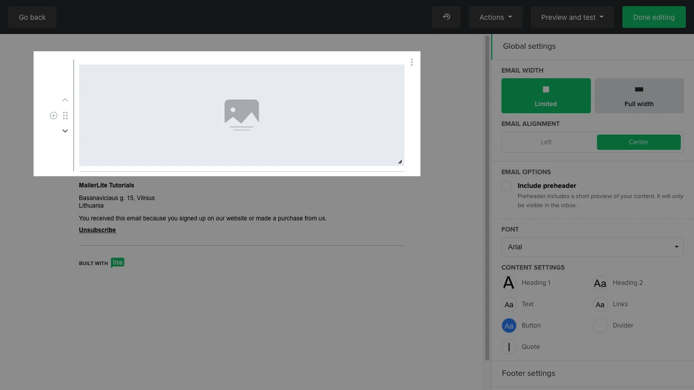 The MailerLite logo will always appear at the bottom of the newsletter on our forever-free plan. If you wish to remove the MailerLite logo from your newsletter, your account must be under the Growing Business or Advanced plan.