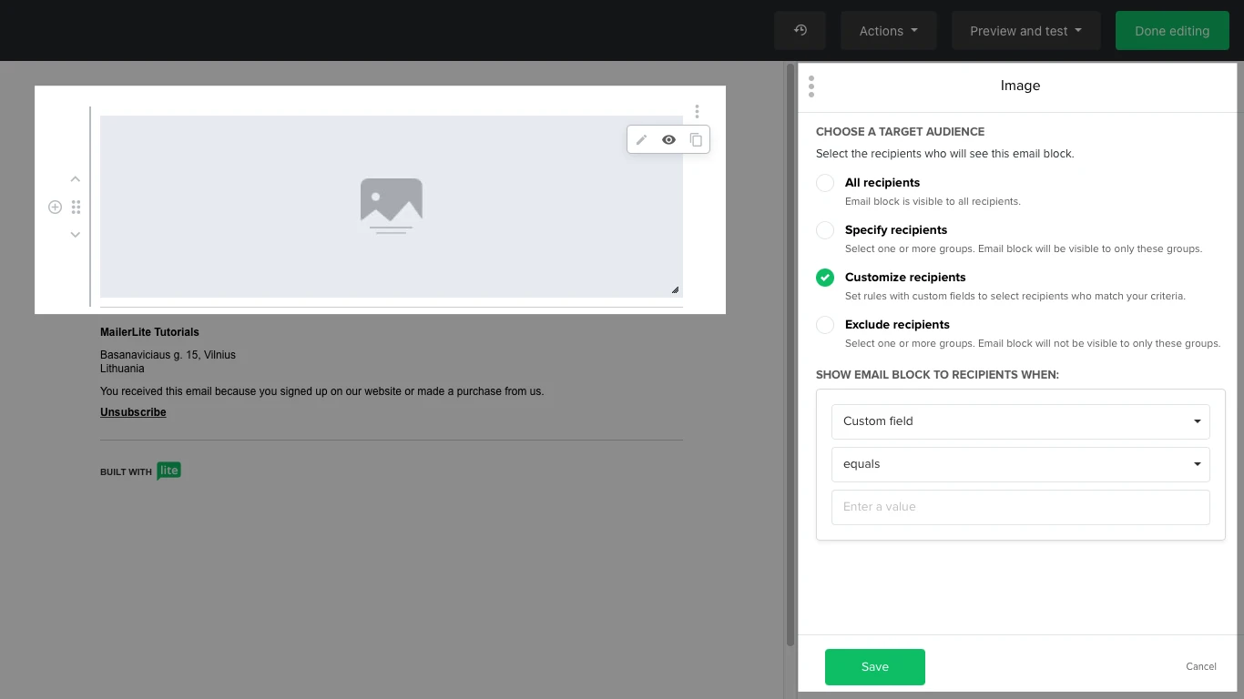 Choose whether you want the specific block to be shown to all recipients, to specific groups, or to subscribers who meet certain rules. To exclude a group, simply do not select them as recipients.