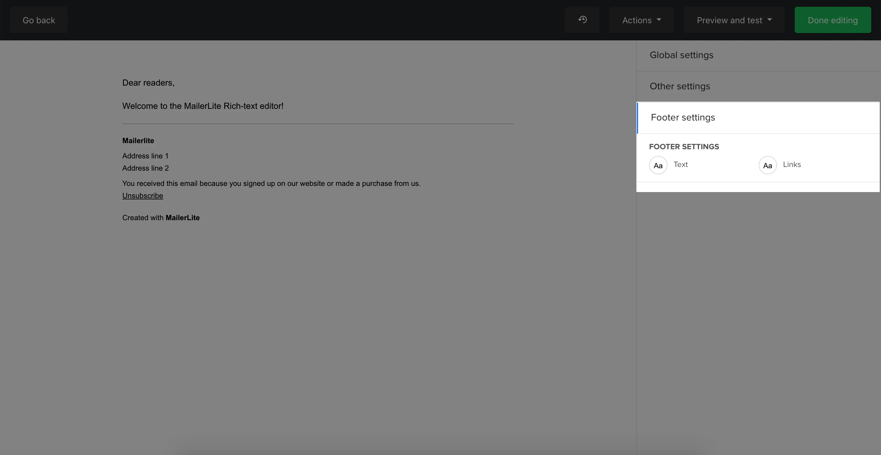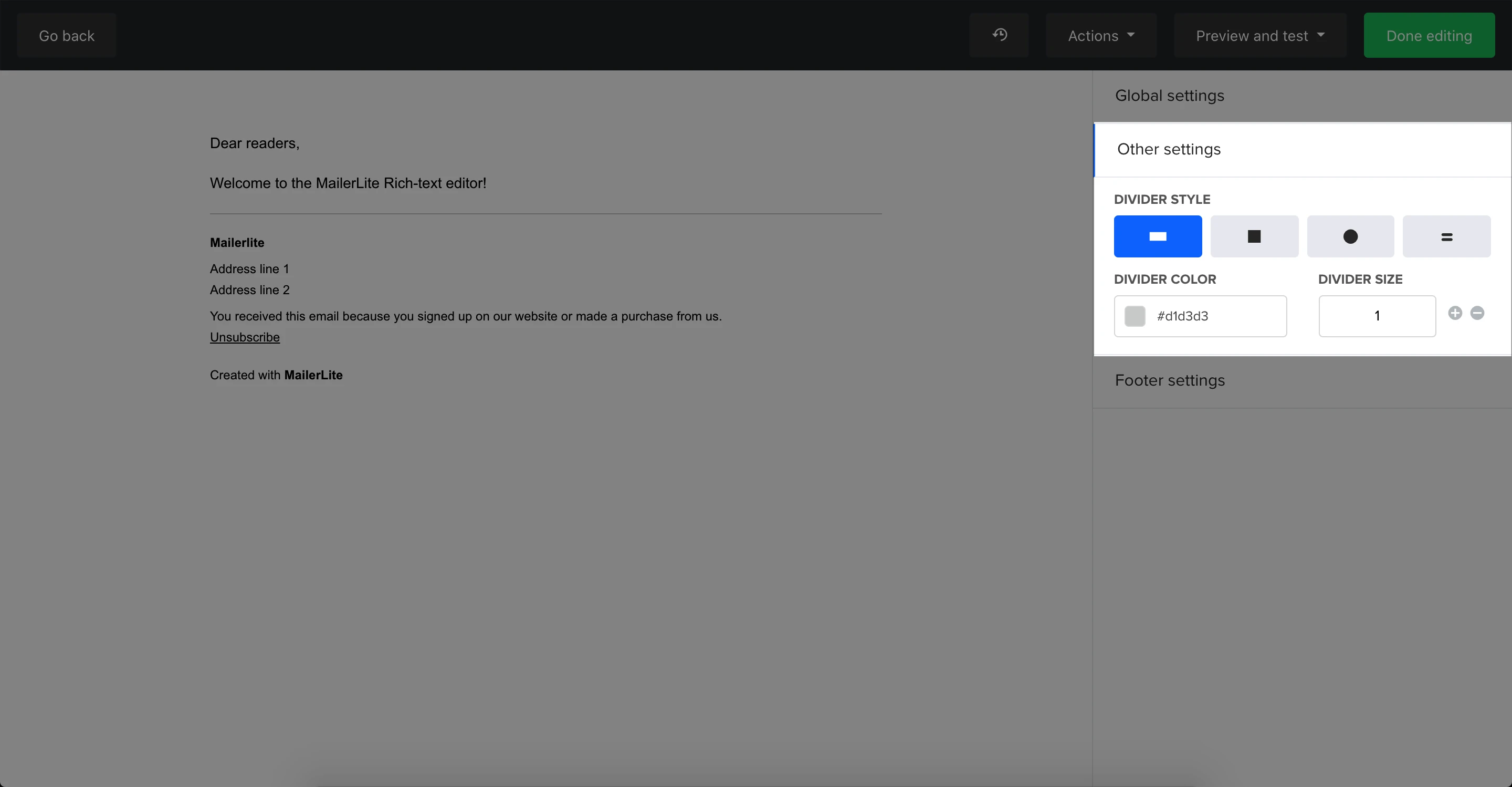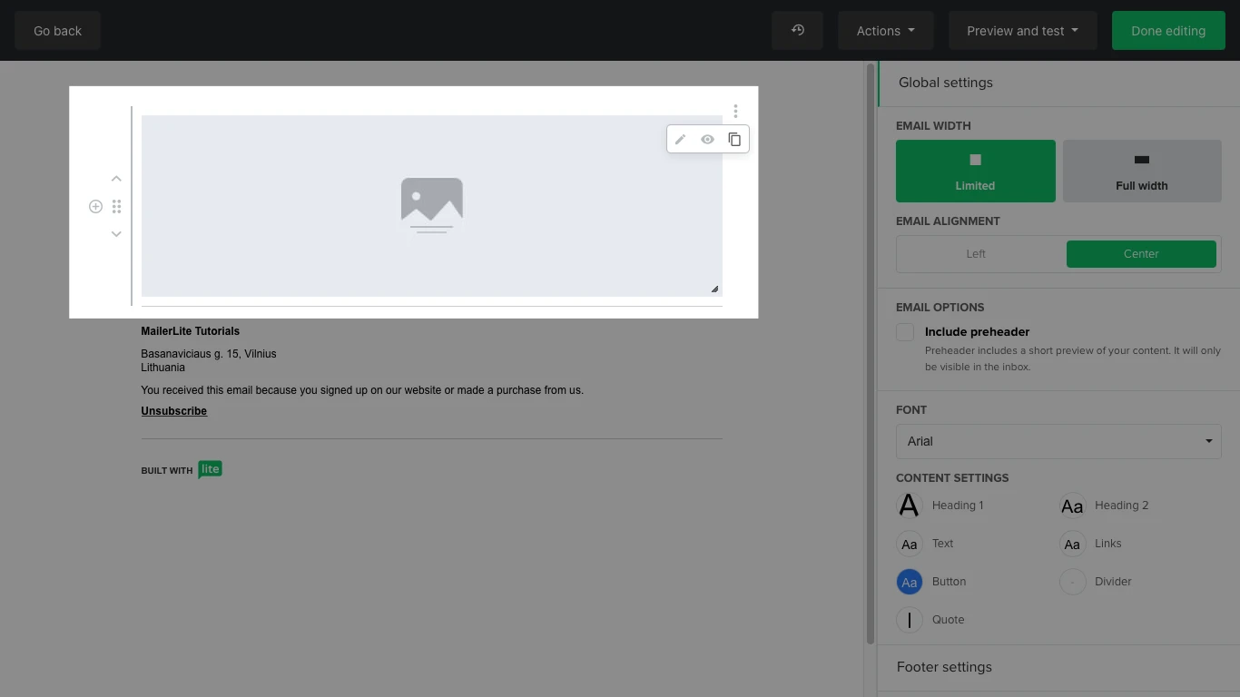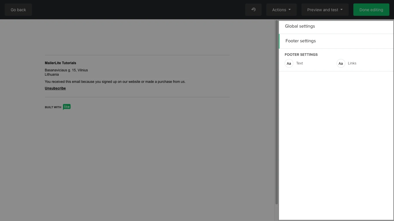 By default, the footer will always include an unsubscribe link and will auto-populate with the information set up in your Account settings page, which you can change at any time.