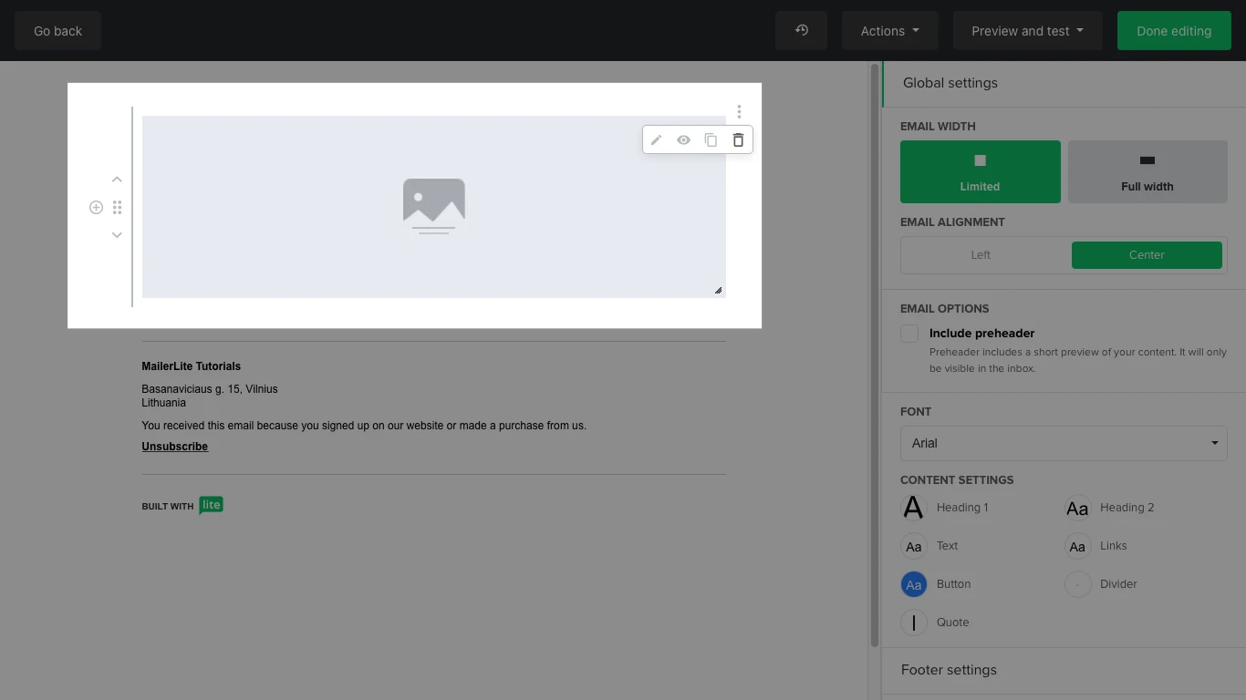 Done editing - This button can be clicked when you’re satisfied with the design of your newsletter. You can also click here to save your unfinished work and come back to it.