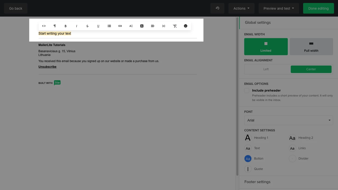 Start out by typing your text. Highlight or double-click it to view the settings you can apply. Bear in mind that these settings are text-specific, meaning that they will only apply to the highlighted text. If you want to apply a change to the entire text within the newsletter, use the global settings.