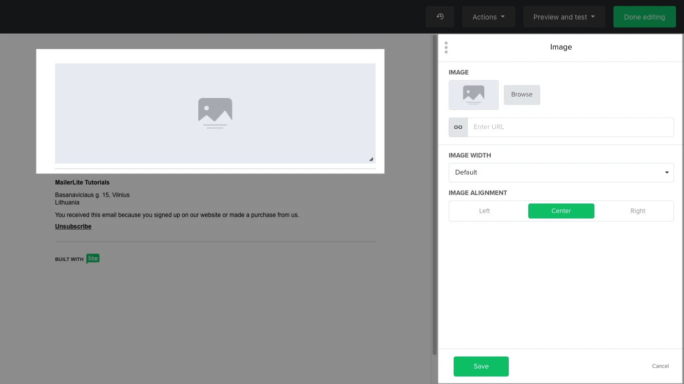 Select the Image block to add a line with an image. Hover over the grey default image and click on the pencil icon to open the Image sidebar. Then add an image via the File manager, hyperlink it to a specific URL, and set its width and alignment.
