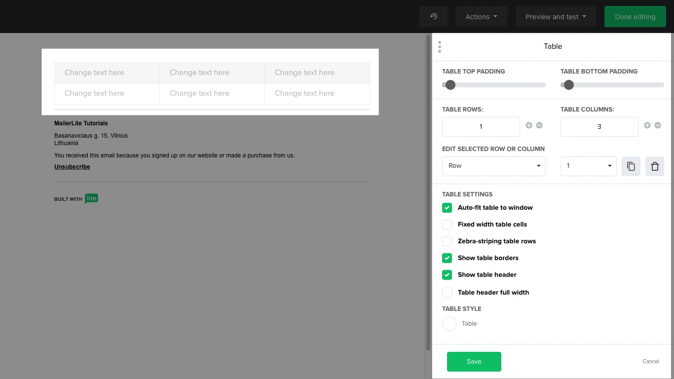 Add a table block to add organized data in your newsletter. To edit the table's settings, click on it to open the Table sidebar. You can add up to ten rows and five columns in one table. You have the options to make the table auto-fit to the subscriber's window, make the cells have a fixed width, give the rows a zebra-stripping design, add borders, include headers, and make the header full-width.Â