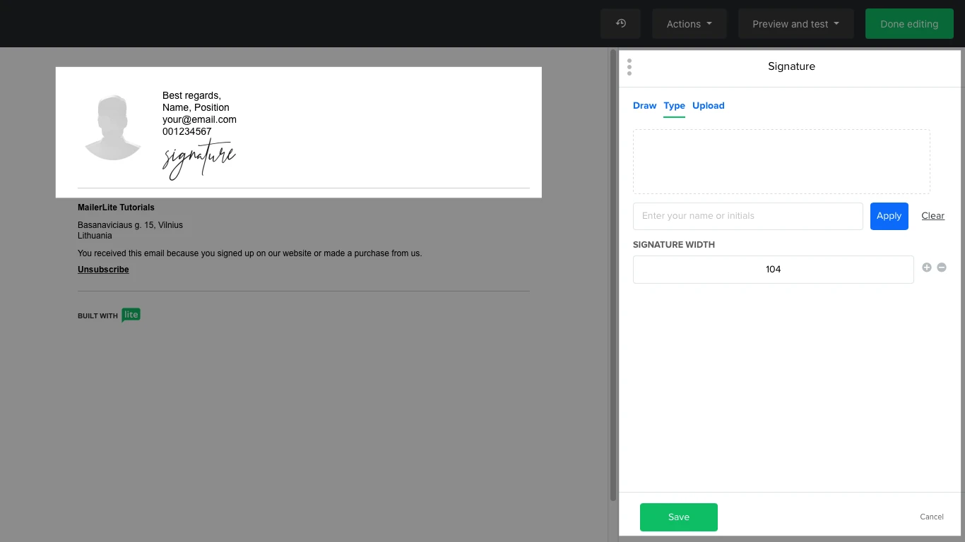 If you want to make it classy, choose the Signature block. You can include a picture along with your personal or company details. Hover over the image and click on the pencil icon to open the sidebar where you can add the image from the File manager, and change its size and radius.