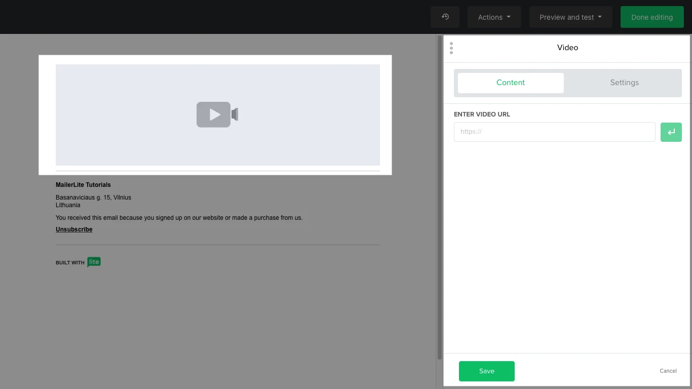 Make your newsletter interactive by embedding a video in it with the Video block. Currently, the Video block only supports YouTube and Vimeo videos. All you have to do is paste the video URL on the block's sidebar and click on the green arrow. You can have the block have an animated image or a static image, which you can upload from the File manager if you want. The block can link to the video itself or to another website, such as a landing page where the video can be watched.