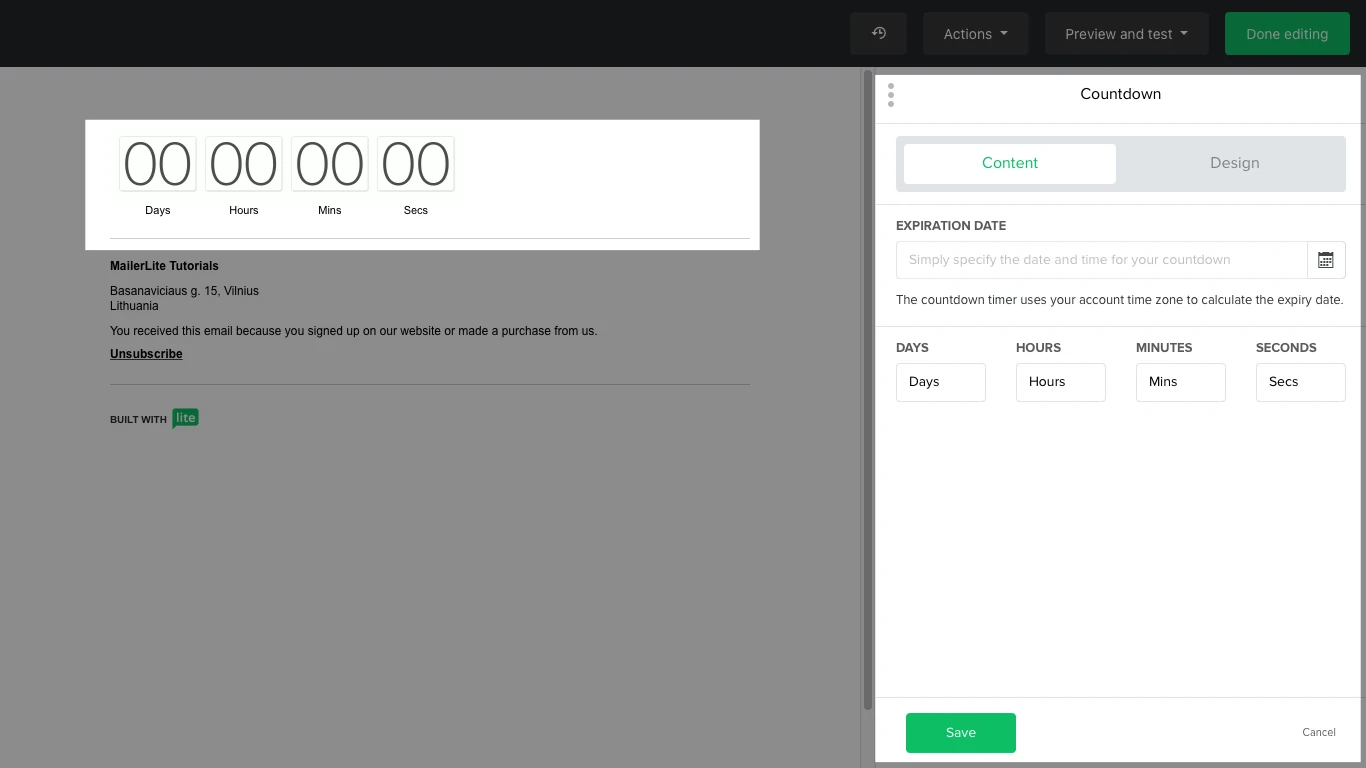 Add a Countdown block to create a timer for a specific event. On the blocks sidebar, you add an expiration date and time of the event. It uses your account time zone to calculate the expiry date for your subscribers.