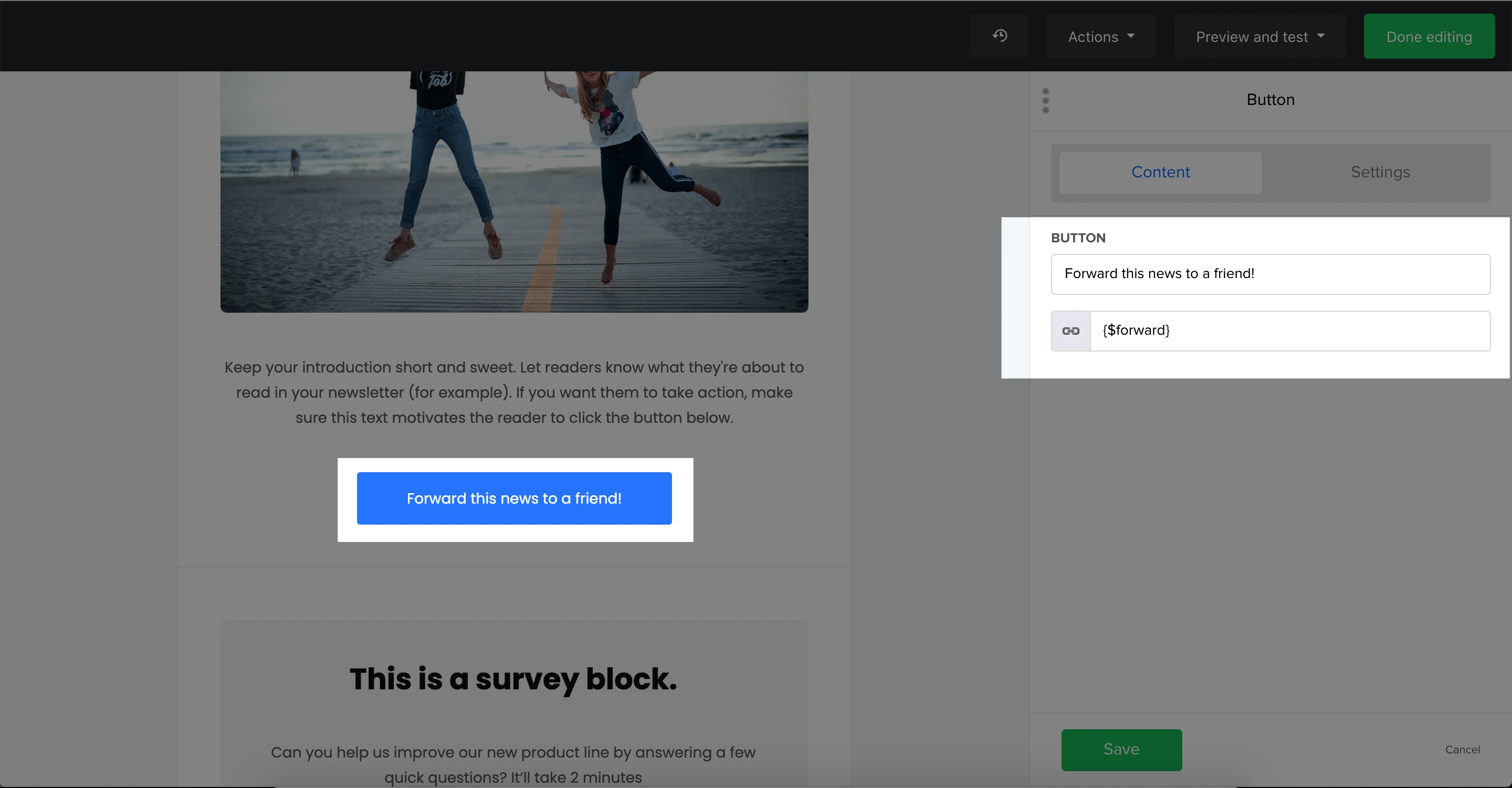 Dynamic variables are like personalized variables, except they allow you to display unique links for each subscriber when you add them to a button block or hyperlink.