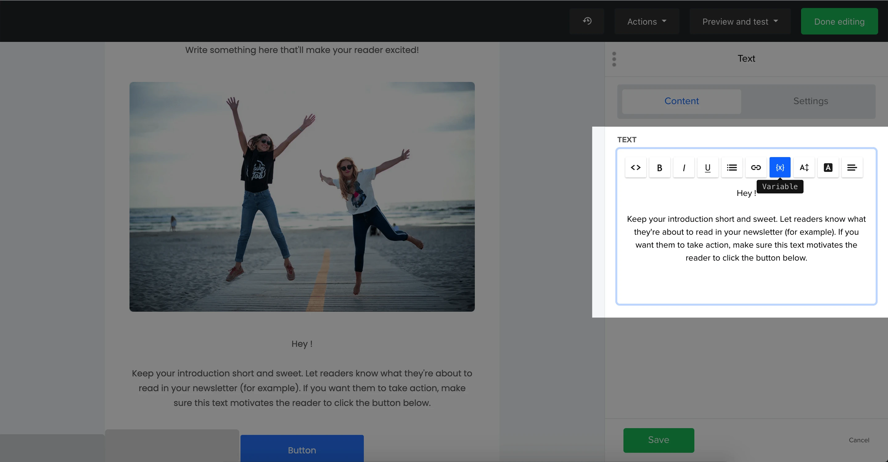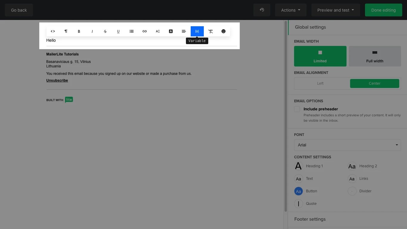 To add personalized variables to your campaign using the Drag and drop editor, we recommend using the Variable button {x}. This will allow you to choose from all of your available merge tags.