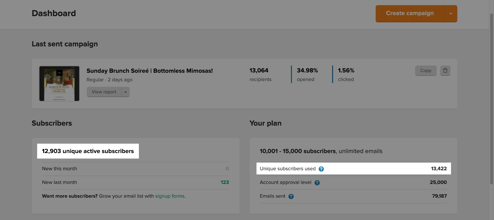 Unique subscribers used refers to the number of subscribers you’ve sent at least one email to in the past 30 days. This can be some or all of the Unique active subscribers on your list.
